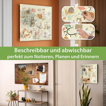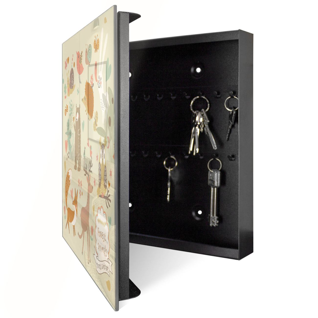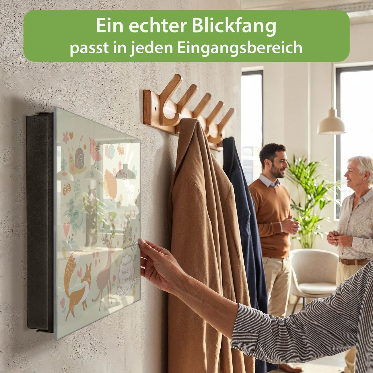 Bringe Ordnung und Eleganz in deinen Eingangsbereich mit dem banjado Schlüsselkasten Motiv Motiv Waldtiere. Die moderne Schlüsselbox kombiniert funktionales Design mit hochwertiger Verarbeitung und wird so zu einem echten Hingucker in Flur, Büro oder Ferienwohnung. ✅ Stilvolle Schlüsselaufbewahrung mit Glasfront im Motiv Motiv Waldtiere Der Design-Schlüsselkasten Motiv Motiv Waldtiere bietet Platz für bis zu 50 Schlüssel, die auf 5 stabilen Reihen mit je 10 Haken übersichtlich verstaut werden. Mit seinen kompakten Maßen von 30 x 30 x 5 cm passt die Schlüsselbox perfekt auch in kleinere Räume. Der schwarz lackierte Stahlkorpus mit rechts angeschlagenem Türscharnier harmoniert mit der Glasfront und fügt sich nahtlos in jedes Wohnambiente ein. Ob als Schlüsselorganizer für Zuhause oder als praktische Lösung für Büros, Praxen und Gewerbe, der banjado Schlüsselkasten sorgt für Ordnung und Übersicht. Dank der magnetischen, mit Kreidestiften beschreibbaren Glasfront kannst du Notizen anheften oder Termine direkt auf der Oberfläche festhalten. Die Schlüsselbox Motiv Motiv Waldtiere zur Wandmontage wird inklusive Befestigungsmaterial geliefert und ist schnell angebracht. So hast du deine Schlüssel jederzeit griffbereit und zugleich stilvoll verstaut. Mit diesem banjado Schlüsselkasten Motiv Motiv Waldtiere kombinierst du praktische Aufbewahrung mit stilvollem Wohndesign. Ob privat oder geschäftlich, die Schlüsselbox sorgt für mehr Ordnung, Übersicht und ein wohnliches Ambiente.Vorteile im Überblick