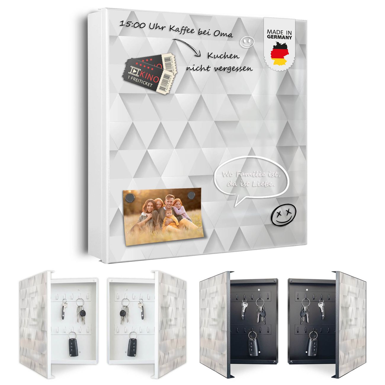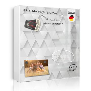 Bringe Ordnung und Eleganz in deinen Eingangsbereich mit dem banjado Schlüsselkasten Motiv Motiv Weisse Dreiecke. Die moderne Schlüsselbox kombiniert funktionales Design mit hochwertiger Verarbeitung und wird so zu einem echten Hingucker in Flur, Büro oder Ferienwohnung. ✅ Stilvolle Schlüsselaufbewahrung mit Motiv Motiv Weisse Dreiecke Der Design-Schlüsselkasten Motiv Motiv Weisse Dreiecke bietet Platz für bis zu 32 Schlüssel, die auf 4 stabilen Reihen mit je 8 Haken übersichtlich verstaut werden. Mit seinen kompakten Maßen von 30 x 30 x 5 cm passt die Schlüsselbox perfekt auch in kleinere Räume. Der weiß lackierte Stahlkorpus mit rechts angeschlagenem Türscharnier harmoniert mit gedruckten Folie auf der Front und fügt sich nahtlos in jedes Wohnambiente ein. Ob als Schlüsselorganizer für Zuhause oder als praktische Lösung für Büros, Praxen und Gewerbe, der banjado Schlüsselkasten sorgt für Ordnung und Übersicht. Dank der magnetischen, mit Kreidestiften beschreibbaren Folie auf der Front kannst du Notizen anheften oder Termine direkt auf der Oberfläche festhalten. Die Schlüsselbox Motiv Motiv Weisse Dreiecke zur Wandmontage wird inklusive Befestigungsmaterial geliefert und ist schnell angebracht. So hast du deine Schlüssel jederzeit griffbereit und zugleich stilvoll verstaut. Mit diesem banjado Schlüsselkasten Motiv Motiv Weisse Dreiecke kombinierst du praktische Aufbewahrung mit stilvollem Wohndesign. Ob privat oder geschäftlich, die Schlüsselbox sorgt für mehr Ordnung, Übersicht und ein wohnliches Ambiente.Vorteile im Überblick