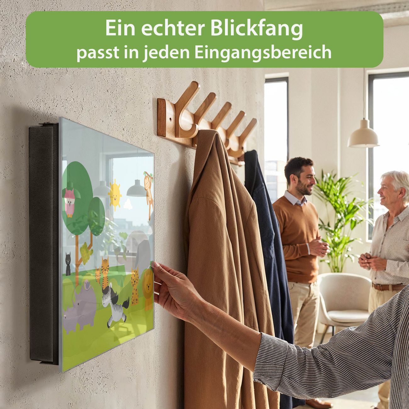 Bringe Ordnung und Eleganz in deinen Eingangsbereich mit dem banjado Schlüsselkasten Motiv Motiv Wilde Tiere. Die moderne Schlüsselbox kombiniert funktionales Design mit hochwertiger Verarbeitung und wird so zu einem echten Hingucker in Flur, Büro oder Ferienwohnung. ✅ Stilvolle Schlüsselaufbewahrung mit Glasfront im Motiv Motiv Wilde Tiere Der Design-Schlüsselkasten Motiv Motiv Wilde Tiere bietet Platz für bis zu 50 Schlüssel, die auf 5 stabilen Reihen mit je 10 Haken übersichtlich verstaut werden. Mit seinen kompakten Maßen von 30 x 30 x 5 cm passt die Schlüsselbox perfekt auch in kleinere Räume. Der schwarz lackierte Stahlkorpus mit rechts angeschlagenem Türscharnier harmoniert mit der Glasfront und fügt sich nahtlos in jedes Wohnambiente ein. Ob als Schlüsselorganizer für Zuhause oder als praktische Lösung für Büros, Praxen und Gewerbe, der banjado Schlüsselkasten sorgt für Ordnung und Übersicht. Dank der magnetischen, mit Kreidestiften beschreibbaren Glasfront kannst du Notizen anheften oder Termine direkt auf der Oberfläche festhalten. Die Schlüsselbox Motiv Motiv Wilde Tiere zur Wandmontage wird inklusive Befestigungsmaterial geliefert und ist schnell angebracht. So hast du deine Schlüssel jederzeit griffbereit und zugleich stilvoll verstaut. Mit diesem banjado Schlüsselkasten Motiv Motiv Wilde Tiere kombinierst du praktische Aufbewahrung mit stilvollem Wohndesign. Ob privat oder geschäftlich, die Schlüsselbox sorgt für mehr Ordnung, Übersicht und ein wohnliches Ambiente.Vorteile im Überblick