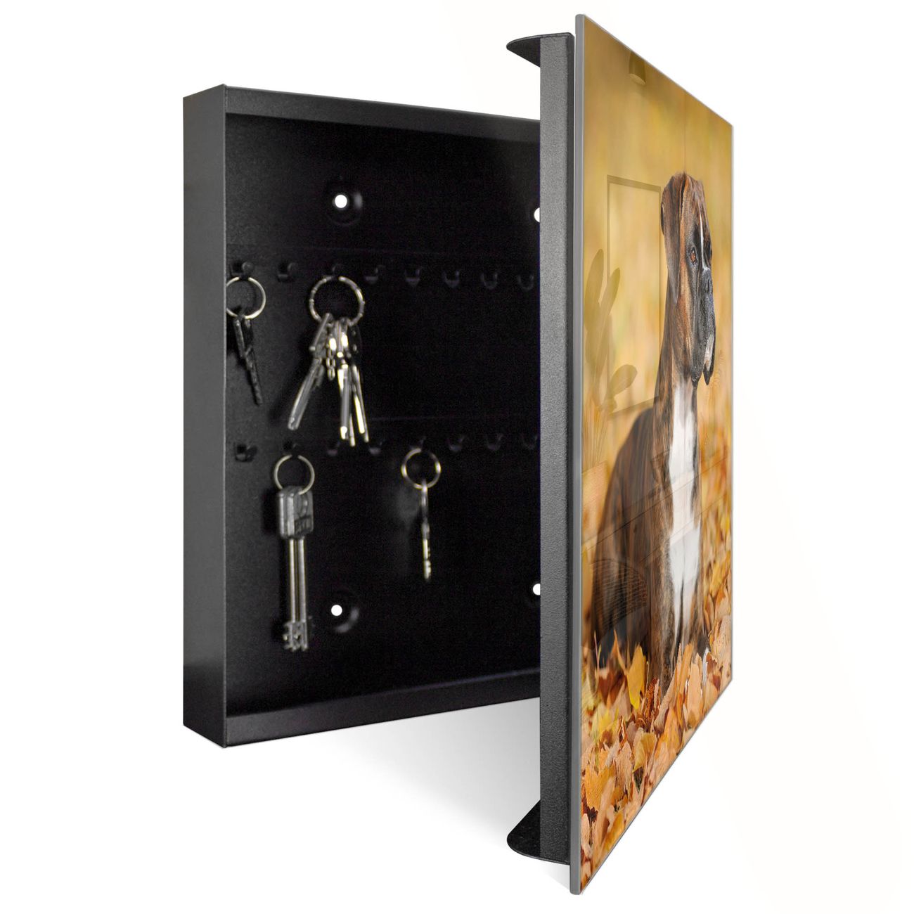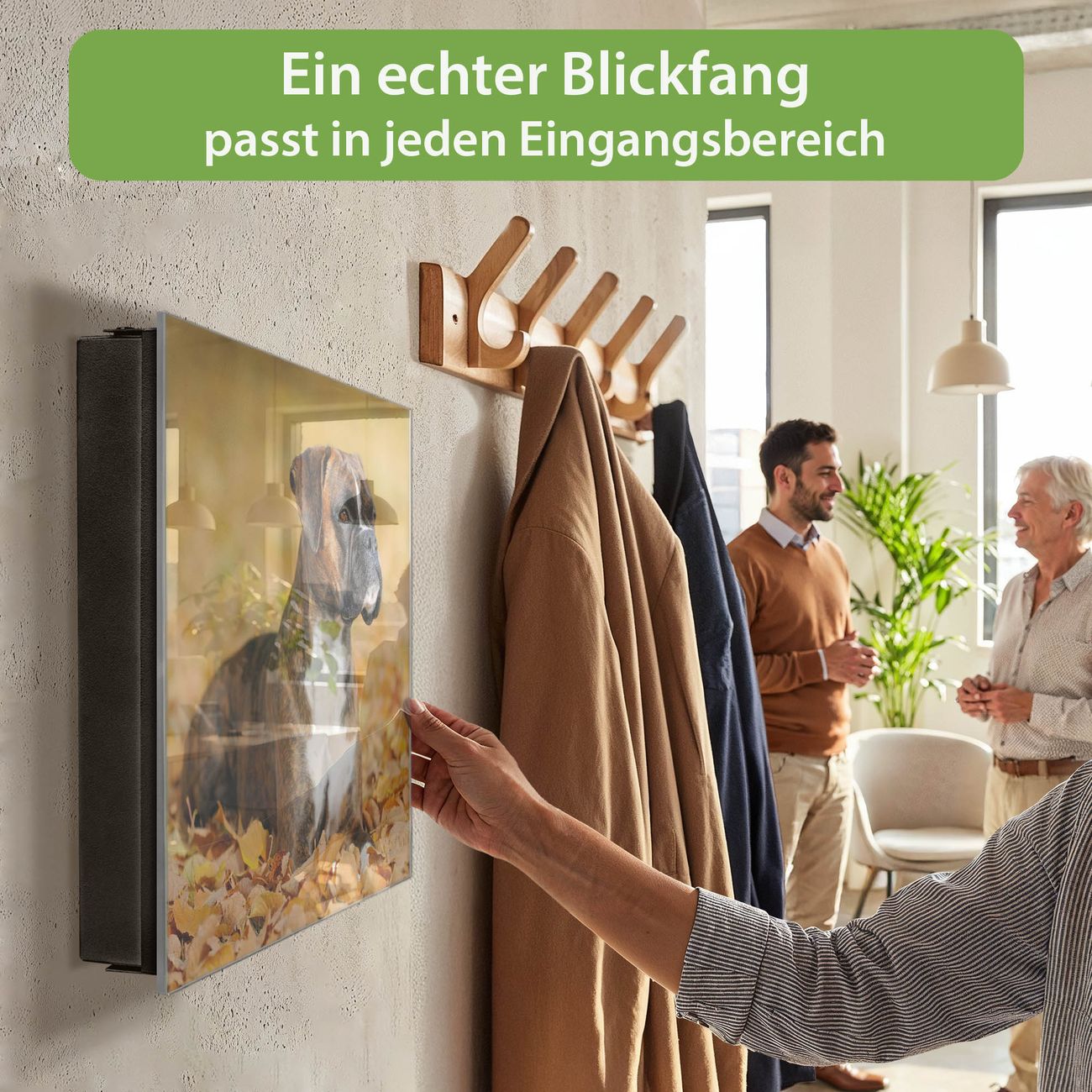 Bringe Ordnung und Eleganz in deinen Eingangsbereich mit dem banjado Schlüsselkasten Motiv Motiv Wilhelm. Die moderne Schlüsselbox kombiniert funktionales Design mit hochwertiger Verarbeitung und wird so zu einem echten Hingucker in Flur, Büro oder Ferienwohnung. ✅ Stilvolle Schlüsselaufbewahrung mit Glasfront im Motiv Motiv Wilhelm Der Design-Schlüsselkasten Motiv Motiv Wilhelm bietet Platz für bis zu 50 Schlüssel, die auf 5 stabilen Reihen mit je 10 Haken übersichtlich verstaut werden. Mit seinen kompakten Maßen von 30 x 30 x 5 cm passt die Schlüsselbox perfekt auch in kleinere Räume. Der schwarz lackierte Stahlkorpus mit rechts angeschlagenem Türscharnier harmoniert mit der Glasfront und fügt sich nahtlos in jedes Wohnambiente ein. Ob als Schlüsselorganizer für Zuhause oder als praktische Lösung für Büros, Praxen und Gewerbe, der banjado Schlüsselkasten sorgt für Ordnung und Übersicht. Dank der magnetischen, mit Kreidestiften beschreibbaren Glasfront kannst du Notizen anheften oder Termine direkt auf der Oberfläche festhalten. Die Schlüsselbox Motiv Motiv Wilhelm zur Wandmontage wird inklusive Befestigungsmaterial geliefert und ist schnell angebracht. So hast du deine Schlüssel jederzeit griffbereit und zugleich stilvoll verstaut. Mit diesem banjado Schlüsselkasten Motiv Motiv Wilhelm kombinierst du praktische Aufbewahrung mit stilvollem Wohndesign. Ob privat oder geschäftlich, die Schlüsselbox sorgt für mehr Ordnung, Übersicht und ein wohnliches Ambiente.Vorteile im Überblick