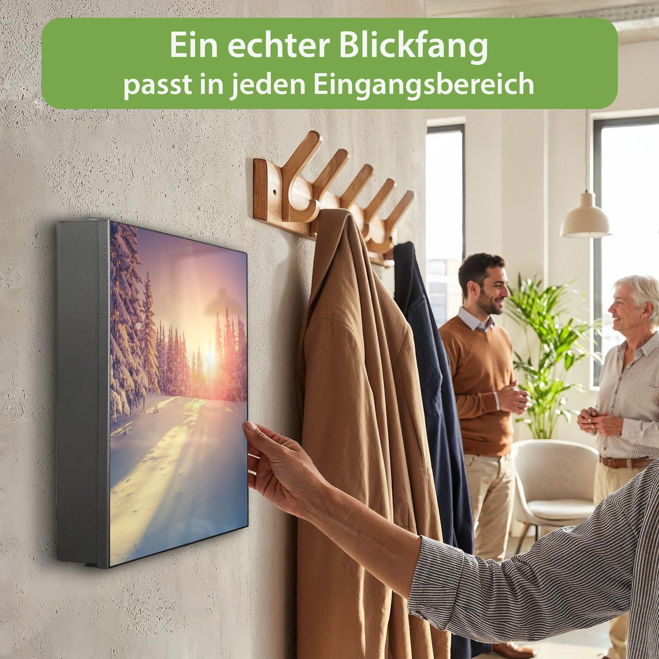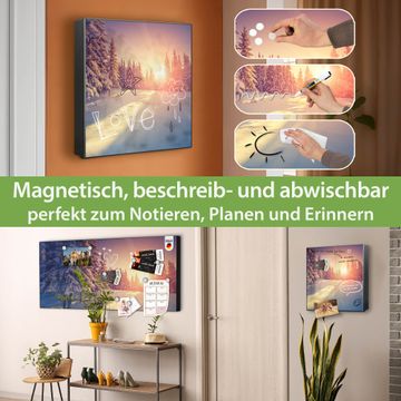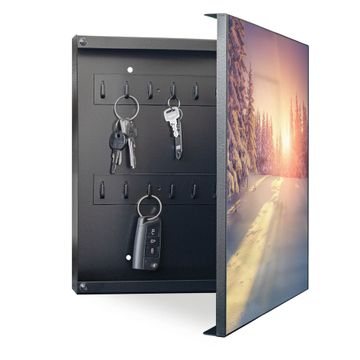 Bringe Ordnung und Eleganz in deinen Eingangsbereich mit dem banjado Schlüsselkasten Motiv Motiv Winterabend. Die moderne Schlüsselbox kombiniert funktionales Design mit hochwertiger Verarbeitung und wird so zu einem echten Hingucker in Flur, Büro oder Ferienwohnung. ✅ Stilvolle Schlüsselaufbewahrung mit Motiv Motiv Winterabend Der Design-Schlüsselkasten Motiv Motiv Winterabend bietet Platz für bis zu 32 Schlüssel, die auf 4 stabilen Reihen mit je 8 Haken übersichtlich verstaut werden. Mit seinen kompakten Maßen von 30 x 30 x 5 cm passt die Schlüsselbox perfekt auch in kleinere Räume. Der schwarz lackierte Stahlkorpus mit rechts angeschlagenem Türscharnier harmoniert mit gedruckten Folie auf der Front und fügt sich nahtlos in jedes Wohnambiente ein. Ob als Schlüsselorganizer für Zuhause oder als praktische Lösung für Büros, Praxen und Gewerbe, der banjado Schlüsselkasten sorgt für Ordnung und Übersicht. Dank der magnetischen, mit Kreidestiften beschreibbaren Folie auf der Front kannst du Notizen anheften oder Termine direkt auf der Oberfläche festhalten. Die Schlüsselbox Motiv Motiv Winterabend zur Wandmontage wird inklusive Befestigungsmaterial geliefert und ist schnell angebracht. So hast du deine Schlüssel jederzeit griffbereit und zugleich stilvoll verstaut. Mit diesem banjado Schlüsselkasten Motiv Motiv Winterabend kombinierst du praktische Aufbewahrung mit stilvollem Wohndesign. Ob privat oder geschäftlich, die Schlüsselbox sorgt für mehr Ordnung, Übersicht und ein wohnliches Ambiente.Vorteile im Überblick