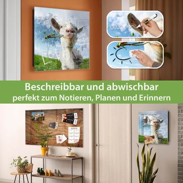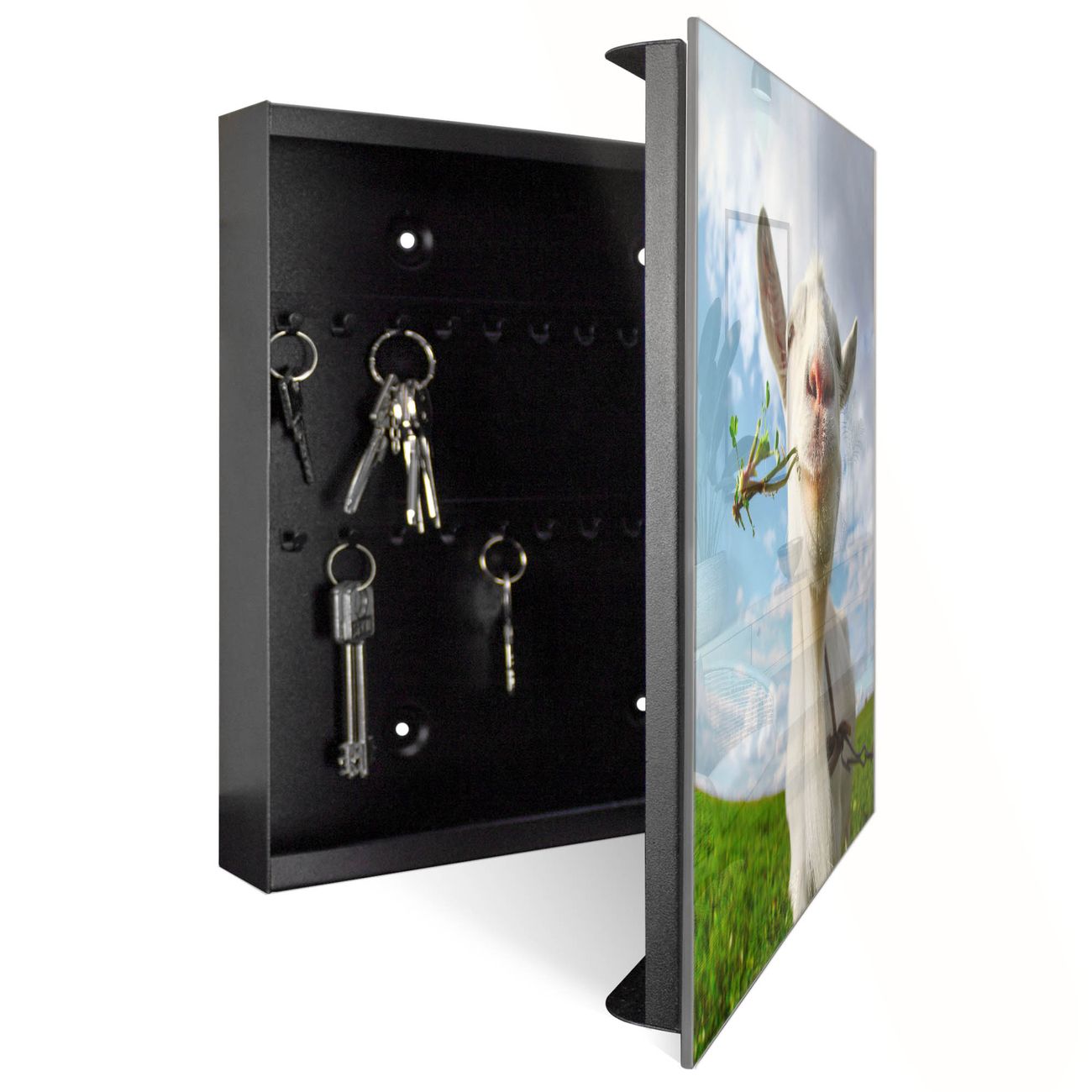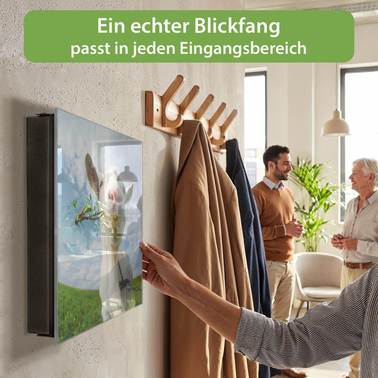 Bringe Ordnung und Eleganz in deinen Eingangsbereich mit dem banjado Schlüsselkasten Motiv Motiv Ziege 2. Die moderne Schlüsselbox kombiniert funktionales Design mit hochwertiger Verarbeitung und wird so zu einem echten Hingucker in Flur, Büro oder Ferienwohnung. ✅ Stilvolle Schlüsselaufbewahrung mit Glasfront im Motiv Motiv Ziege 2 Der Design-Schlüsselkasten Motiv Motiv Ziege 2 bietet Platz für bis zu 50 Schlüssel, die auf 5 stabilen Reihen mit je 10 Haken übersichtlich verstaut werden. Mit seinen kompakten Maßen von 30 x 30 x 5 cm passt die Schlüsselbox perfekt auch in kleinere Räume. Der schwarz lackierte Stahlkorpus mit rechts angeschlagenem Türscharnier harmoniert mit der Glasfront und fügt sich nahtlos in jedes Wohnambiente ein. Ob als Schlüsselorganizer für Zuhause oder als praktische Lösung für Büros, Praxen und Gewerbe, der banjado Schlüsselkasten sorgt für Ordnung und Übersicht. Dank der magnetischen, mit Kreidestiften beschreibbaren Glasfront kannst du Notizen anheften oder Termine direkt auf der Oberfläche festhalten. Die Schlüsselbox Motiv Motiv Ziege 2 zur Wandmontage wird inklusive Befestigungsmaterial geliefert und ist schnell angebracht. So hast du deine Schlüssel jederzeit griffbereit und zugleich stilvoll verstaut. Mit diesem banjado Schlüsselkasten Motiv Motiv Ziege 2 kombinierst du praktische Aufbewahrung mit stilvollem Wohndesign. Ob privat oder geschäftlich, die Schlüsselbox sorgt für mehr Ordnung, Übersicht und ein wohnliches Ambiente.Vorteile im Überblick