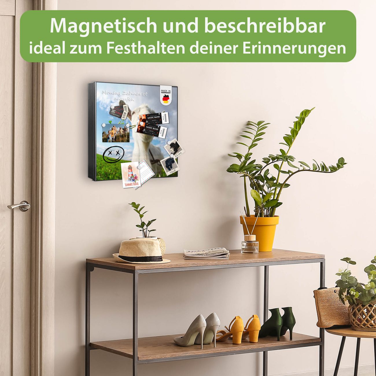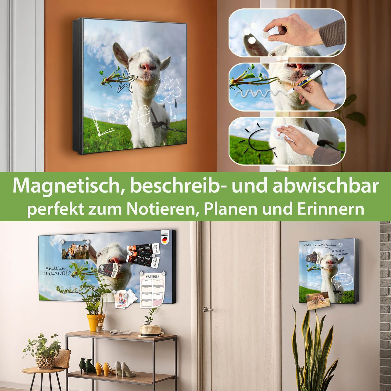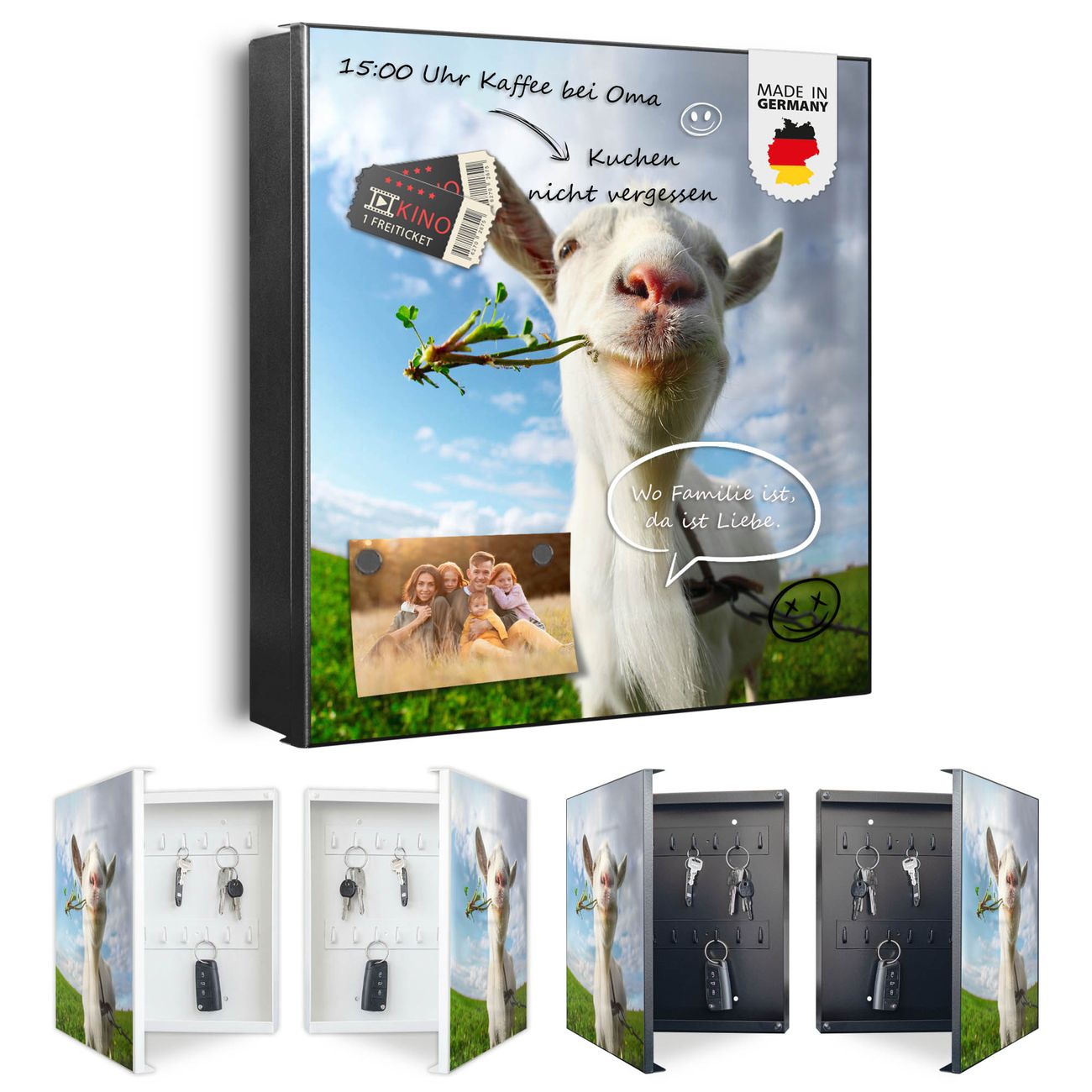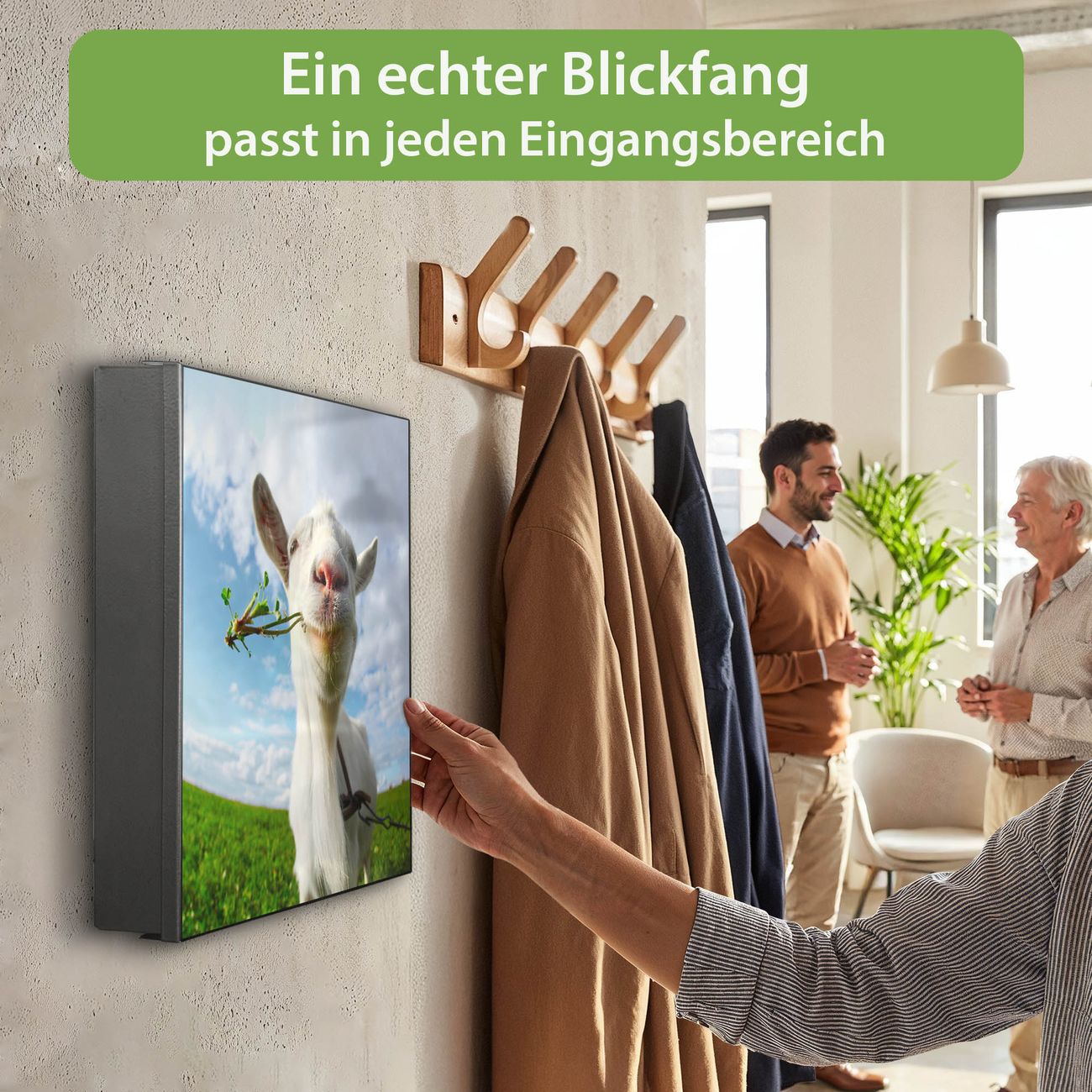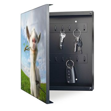 Bringe Ordnung und Eleganz in deinen Eingangsbereich mit dem banjado Schlüsselkasten Motiv Motiv Ziege 2. Die moderne Schlüsselbox kombiniert funktionales Design mit hochwertiger Verarbeitung und wird so zu einem echten Hingucker in Flur, Büro oder Ferienwohnung. ✅ Stilvolle Schlüsselaufbewahrung mit Motiv Motiv Ziege 2 Der Design-Schlüsselkasten Motiv Motiv Ziege 2 bietet Platz für bis zu 32 Schlüssel, die auf 4 stabilen Reihen mit je 8 Haken übersichtlich verstaut werden. Mit seinen kompakten Maßen von 30 x 30 x 5 cm passt die Schlüsselbox perfekt auch in kleinere Räume. Der schwarz lackierte Stahlkorpus mit links angeschlagenem Türscharnier harmoniert mit gedruckten Folie auf der Front und fügt sich nahtlos in jedes Wohnambiente ein. Ob als Schlüsselorganizer für Zuhause oder als praktische Lösung für Büros, Praxen und Gewerbe, der banjado Schlüsselkasten sorgt für Ordnung und Übersicht. Dank der magnetischen, mit Kreidestiften beschreibbaren Folie auf der Front kannst du Notizen anheften oder Termine direkt auf der Oberfläche festhalten. Die Schlüsselbox Motiv Motiv Ziege 2 zur Wandmontage wird inklusive Befestigungsmaterial geliefert und ist schnell angebracht. So hast du deine Schlüssel jederzeit griffbereit und zugleich stilvoll verstaut. Mit diesem banjado Schlüsselkasten Motiv Motiv Ziege 2 kombinierst du praktische Aufbewahrung mit stilvollem Wohndesign. Ob privat oder geschäftlich, die Schlüsselbox sorgt für mehr Ordnung, Übersicht und ein wohnliches Ambiente.Vorteile im Überblick