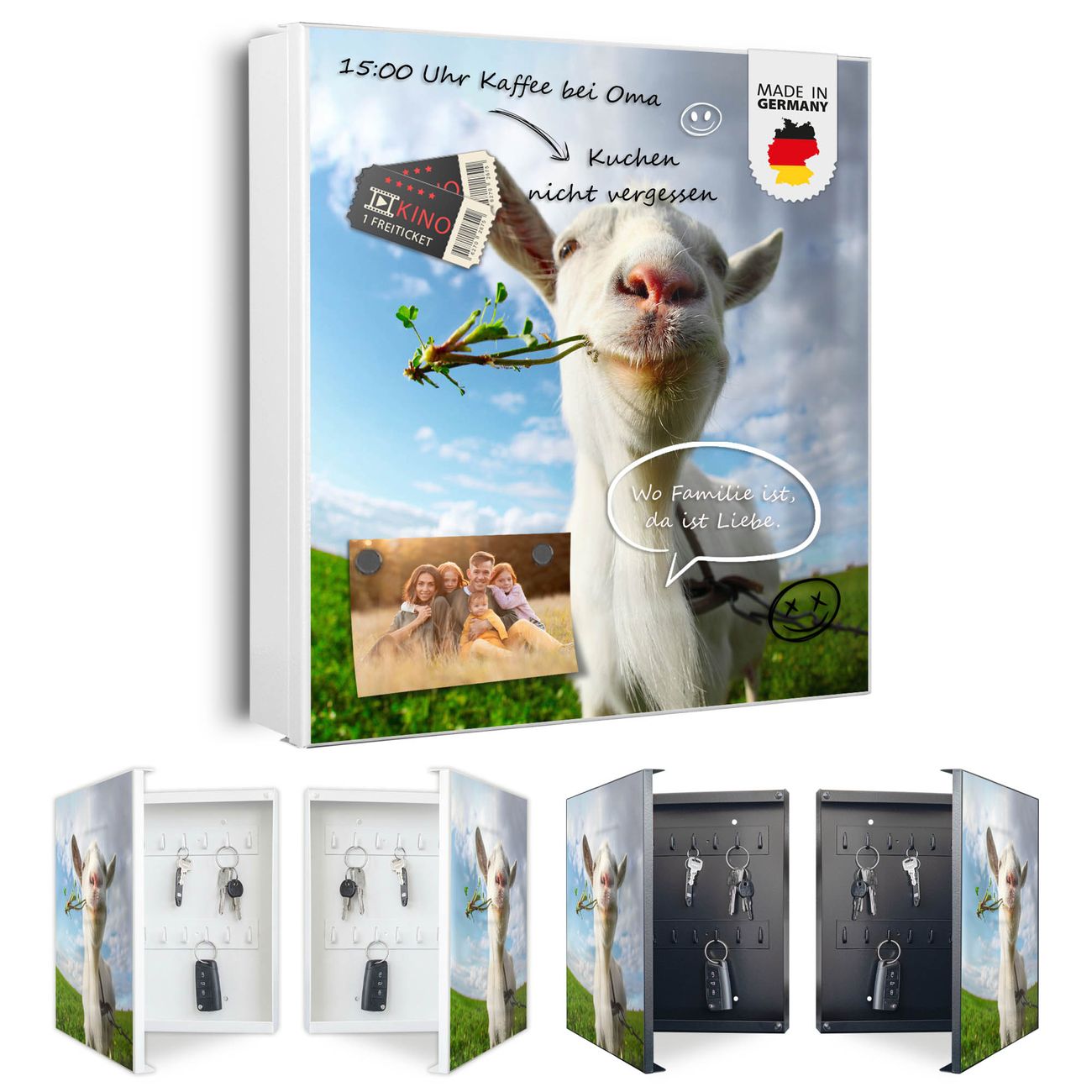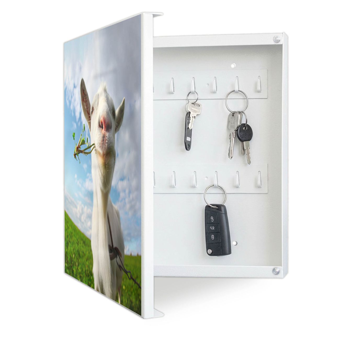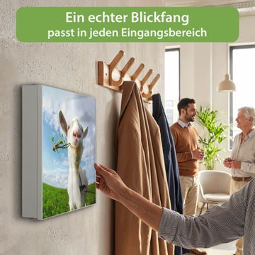Bringe Ordnung und Eleganz in deinen Eingangsbereich mit dem banjado Schlüsselkasten Motiv Motiv Ziege 2. Die moderne Schlüsselbox kombiniert funktionales Design mit hochwertiger Verarbeitung und wird so zu einem echten Hingucker in Flur, Büro oder Ferienwohnung. ✅ Stilvolle Schlüsselaufbewahrung mit Motiv Motiv Ziege 2 Der Design-Schlüsselkasten Motiv Motiv Ziege 2 bietet Platz für bis zu 32 Schlüssel, die auf 4 stabilen Reihen mit je 8 Haken übersichtlich verstaut werden. Mit seinen kompakten Maßen von 30 x 30 x 5 cm passt die Schlüsselbox perfekt auch in kleinere Räume. Der weiß lackierte Stahlkorpus mit links angeschlagenem Türscharnier harmoniert mit gedruckten Folie auf der Front und fügt sich nahtlos in jedes Wohnambiente ein. Ob als Schlüsselorganizer für Zuhause oder als praktische Lösung für Büros, Praxen und Gewerbe, der banjado Schlüsselkasten sorgt für Ordnung und Übersicht. Dank der magnetischen, mit Kreidestiften beschreibbaren Folie auf der Front kannst du Notizen anheften oder Termine direkt auf der Oberfläche festhalten. Die Schlüsselbox Motiv Motiv Ziege 2 zur Wandmontage wird inklusive Befestigungsmaterial geliefert und ist schnell angebracht. So hast du deine Schlüssel jederzeit griffbereit und zugleich stilvoll verstaut. Mit diesem banjado Schlüsselkasten Motiv Motiv Ziege 2 kombinierst du praktische Aufbewahrung mit stilvollem Wohndesign. Ob privat oder geschäftlich, die Schlüsselbox sorgt für mehr Ordnung, Übersicht und ein wohnliches Ambiente.Vorteile im Überblick