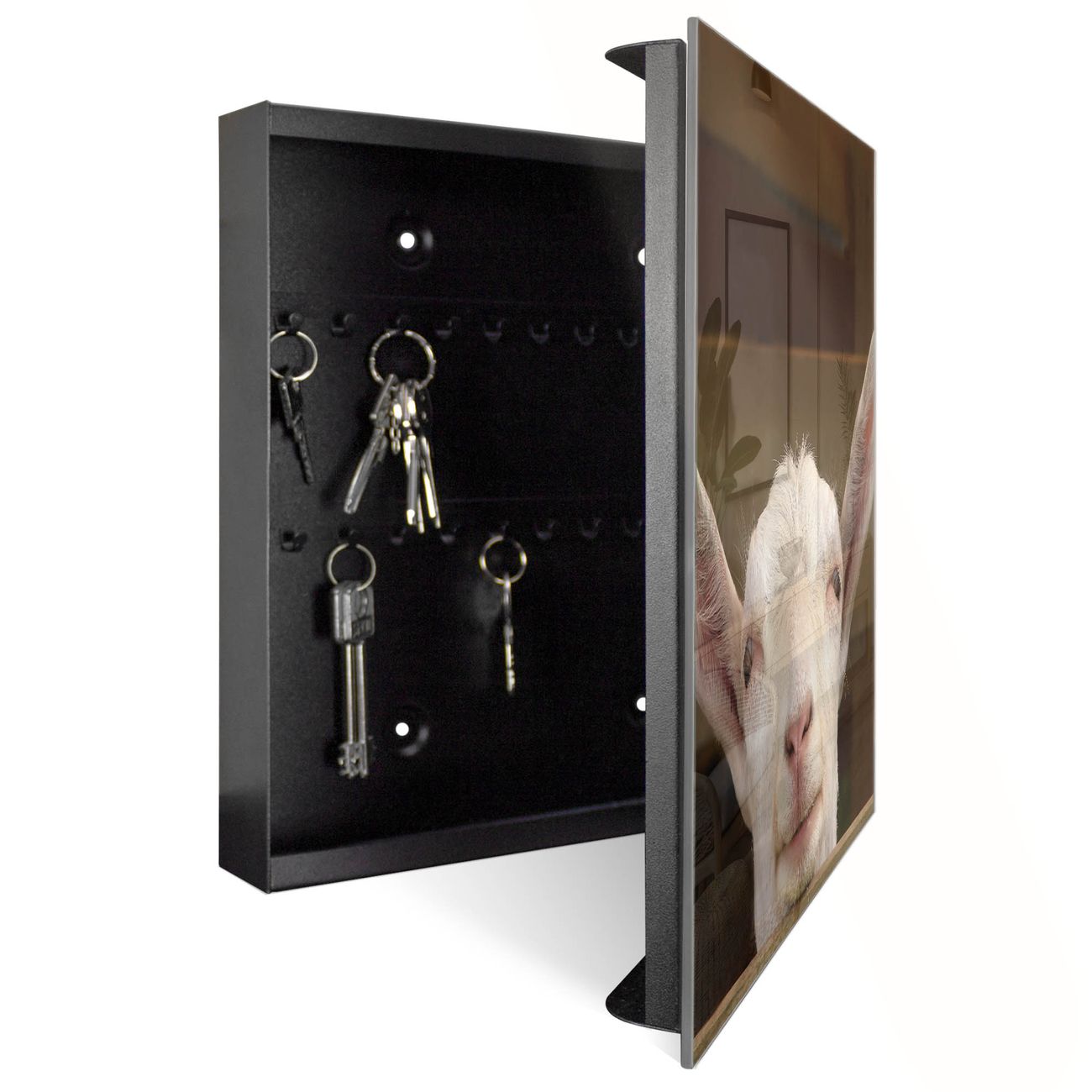 Bringe Ordnung und Eleganz in deinen Eingangsbereich mit dem banjado Schlüsselkasten Motiv Motiv Ziege. Die moderne Schlüsselbox kombiniert funktionales Design mit hochwertiger Verarbeitung und wird so zu einem echten Hingucker in Flur, Büro oder Ferienwohnung. ✅ Stilvolle Schlüsselaufbewahrung mit Glasfront im Motiv Motiv Ziege Der Design-Schlüsselkasten Motiv Motiv Ziege bietet Platz für bis zu 50 Schlüssel, die auf 5 stabilen Reihen mit je 10 Haken übersichtlich verstaut werden. Mit seinen kompakten Maßen von 30 x 30 x 5 cm passt die Schlüsselbox perfekt auch in kleinere Räume. Der schwarz lackierte Stahlkorpus mit rechts angeschlagenem Türscharnier harmoniert mit der Glasfront und fügt sich nahtlos in jedes Wohnambiente ein. Ob als Schlüsselorganizer für Zuhause oder als praktische Lösung für Büros, Praxen und Gewerbe, der banjado Schlüsselkasten sorgt für Ordnung und Übersicht. Dank der magnetischen, mit Kreidestiften beschreibbaren Glasfront kannst du Notizen anheften oder Termine direkt auf der Oberfläche festhalten. Die Schlüsselbox Motiv Motiv Ziege zur Wandmontage wird inklusive Befestigungsmaterial geliefert und ist schnell angebracht. So hast du deine Schlüssel jederzeit griffbereit und zugleich stilvoll verstaut. Mit diesem banjado Schlüsselkasten Motiv Motiv Ziege kombinierst du praktische Aufbewahrung mit stilvollem Wohndesign. Ob privat oder geschäftlich, die Schlüsselbox sorgt für mehr Ordnung, Übersicht und ein wohnliches Ambiente.Vorteile im Überblick