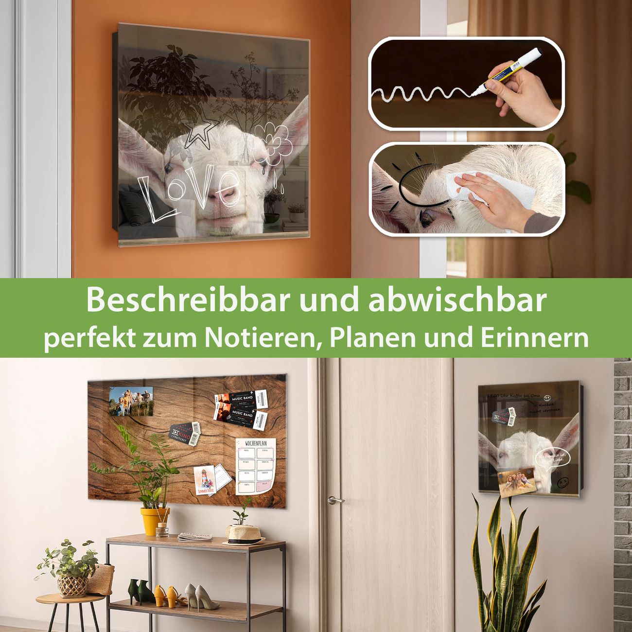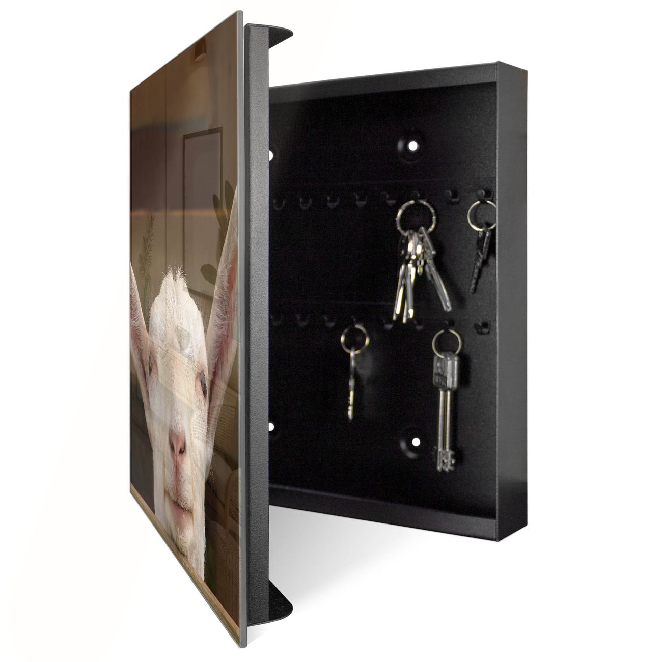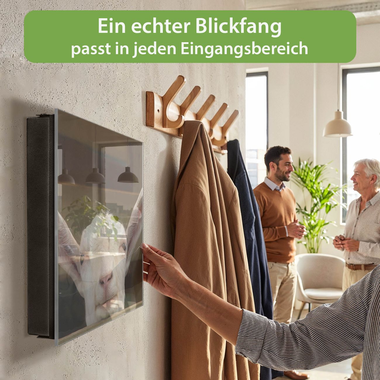 Bringe Ordnung und Eleganz in deinen Eingangsbereich mit dem banjado Schlüsselkasten Motiv Motiv Ziege. Die moderne Schlüsselbox kombiniert funktionales Design mit hochwertiger Verarbeitung und wird so zu einem echten Hingucker in Flur, Büro oder Ferienwohnung. ✅ Stilvolle Schlüsselaufbewahrung mit Glasfront im Motiv Motiv Ziege Der Design-Schlüsselkasten Motiv Motiv Ziege bietet Platz für bis zu 50 Schlüssel, die auf 5 stabilen Reihen mit je 10 Haken übersichtlich verstaut werden. Mit seinen kompakten Maßen von 30 x 30 x 5 cm passt die Schlüsselbox perfekt auch in kleinere Räume. Der schwarz lackierte Stahlkorpus mit rechts angeschlagenem Türscharnier harmoniert mit der Glasfront und fügt sich nahtlos in jedes Wohnambiente ein. Ob als Schlüsselorganizer für Zuhause oder als praktische Lösung für Büros, Praxen und Gewerbe, der banjado Schlüsselkasten sorgt für Ordnung und Übersicht. Dank der magnetischen, mit Kreidestiften beschreibbaren Glasfront kannst du Notizen anheften oder Termine direkt auf der Oberfläche festhalten. Die Schlüsselbox Motiv Motiv Ziege zur Wandmontage wird inklusive Befestigungsmaterial geliefert und ist schnell angebracht. So hast du deine Schlüssel jederzeit griffbereit und zugleich stilvoll verstaut. Mit diesem banjado Schlüsselkasten Motiv Motiv Ziege kombinierst du praktische Aufbewahrung mit stilvollem Wohndesign. Ob privat oder geschäftlich, die Schlüsselbox sorgt für mehr Ordnung, Übersicht und ein wohnliches Ambiente.Vorteile im Überblick