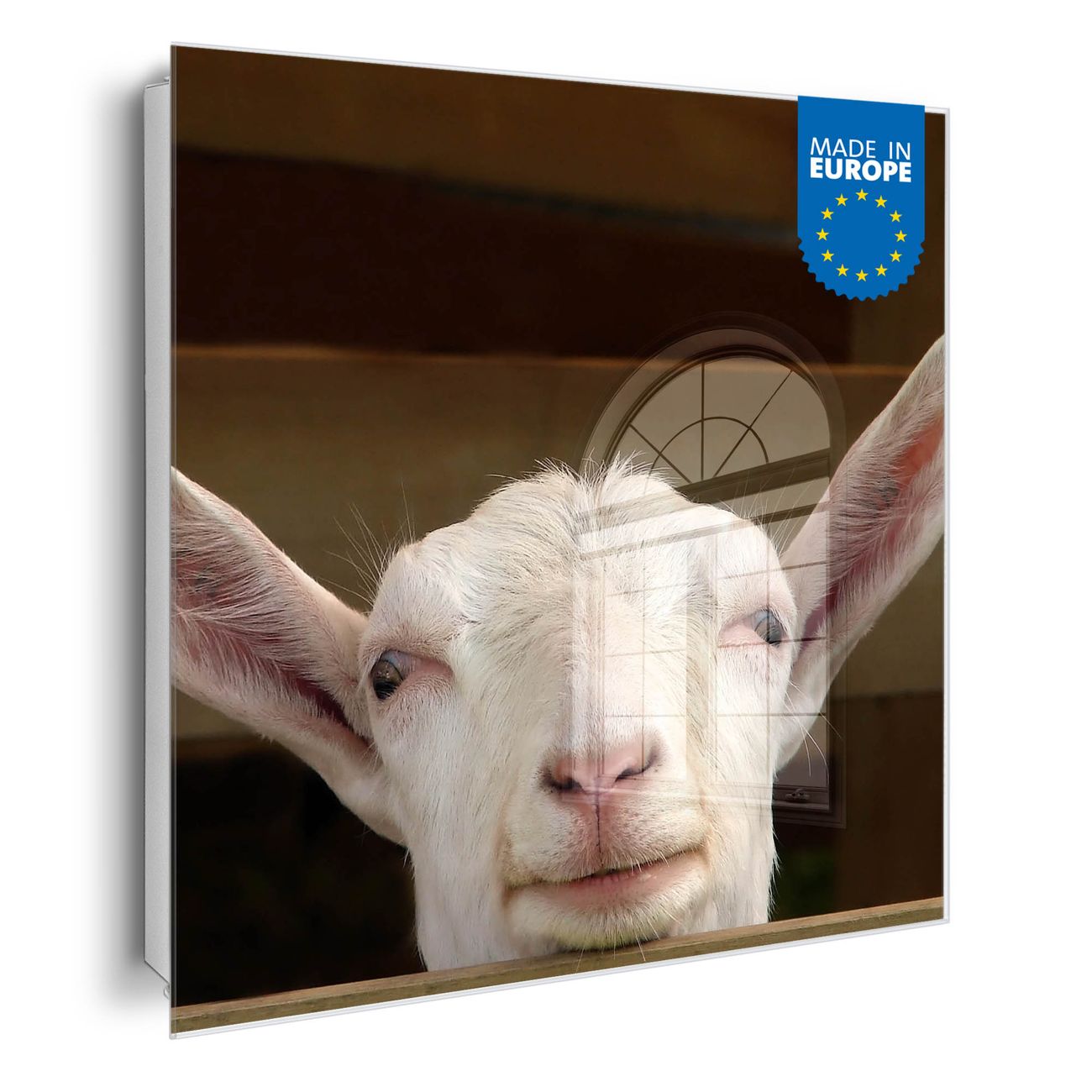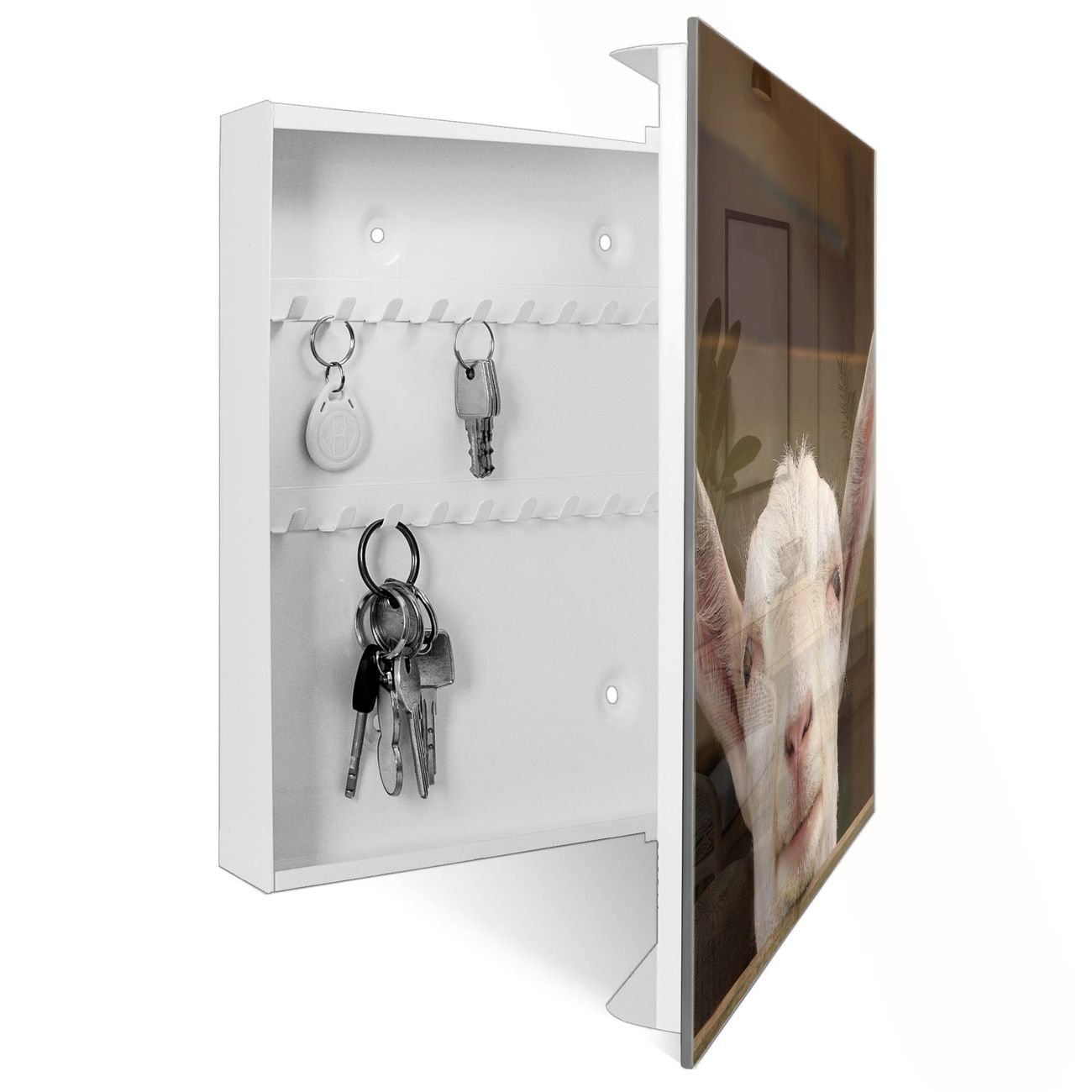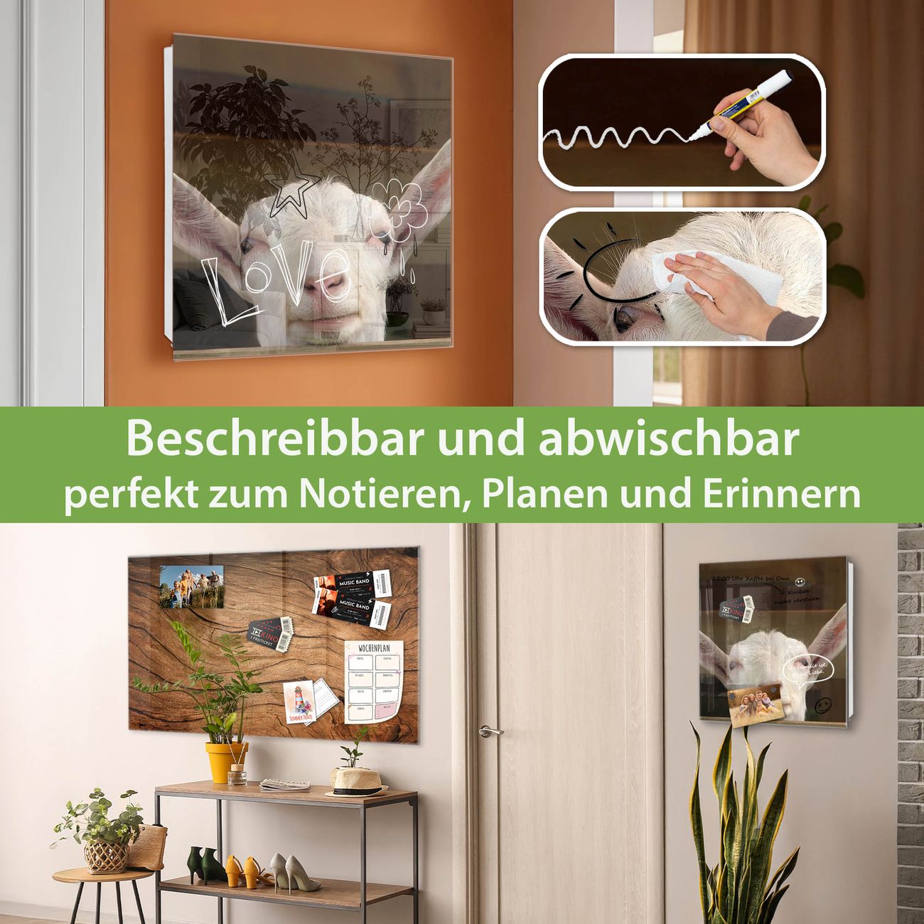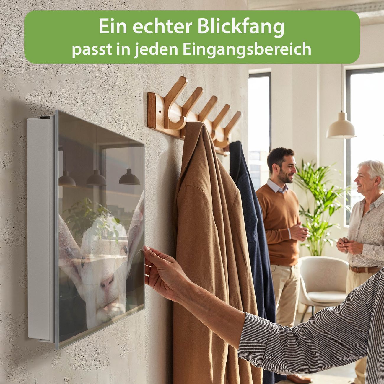 Bringe Ordnung und Eleganz in deinen Eingangsbereich mit dem banjado Schlüsselkasten Motiv Motiv Ziege. Die moderne Schlüsselbox kombiniert funktionales Design mit hochwertiger Verarbeitung und wird so zu einem echten Hingucker in Flur, Büro oder Ferienwohnung. ✅ Stilvolle Schlüsselaufbewahrung mit Glasfront im Motiv Motiv Ziege Der Design-Schlüsselkasten Motiv Motiv Ziege bietet Platz für bis zu 50 Schlüssel, die auf 5 stabilen Reihen mit je 10 Haken übersichtlich verstaut werden. Mit seinen kompakten Maßen von 30 x 30 x 5 cm passt die Schlüsselbox perfekt auch in kleinere Räume. Der weiß lackierte Stahlkorpus mit rechts angeschlagenem Türscharnier harmoniert mit der Glasfront und fügt sich nahtlos in jedes Wohnambiente ein. Ob als Schlüsselorganizer für Zuhause oder als praktische Lösung für Büros, Praxen und Gewerbe, der banjado Schlüsselkasten sorgt für Ordnung und Übersicht. Dank der magnetischen, mit Kreidestiften beschreibbaren Glasfront kannst du Notizen anheften oder Termine direkt auf der Oberfläche festhalten. Die Schlüsselbox Motiv Motiv Ziege zur Wandmontage wird inklusive Befestigungsmaterial geliefert und ist schnell angebracht. So hast du deine Schlüssel jederzeit griffbereit und zugleich stilvoll verstaut. Mit diesem banjado Schlüsselkasten Motiv Motiv Ziege kombinierst du praktische Aufbewahrung mit stilvollem Wohndesign. Ob privat oder geschäftlich, die Schlüsselbox sorgt für mehr Ordnung, Übersicht und ein wohnliches Ambiente.Vorteile im Überblick
