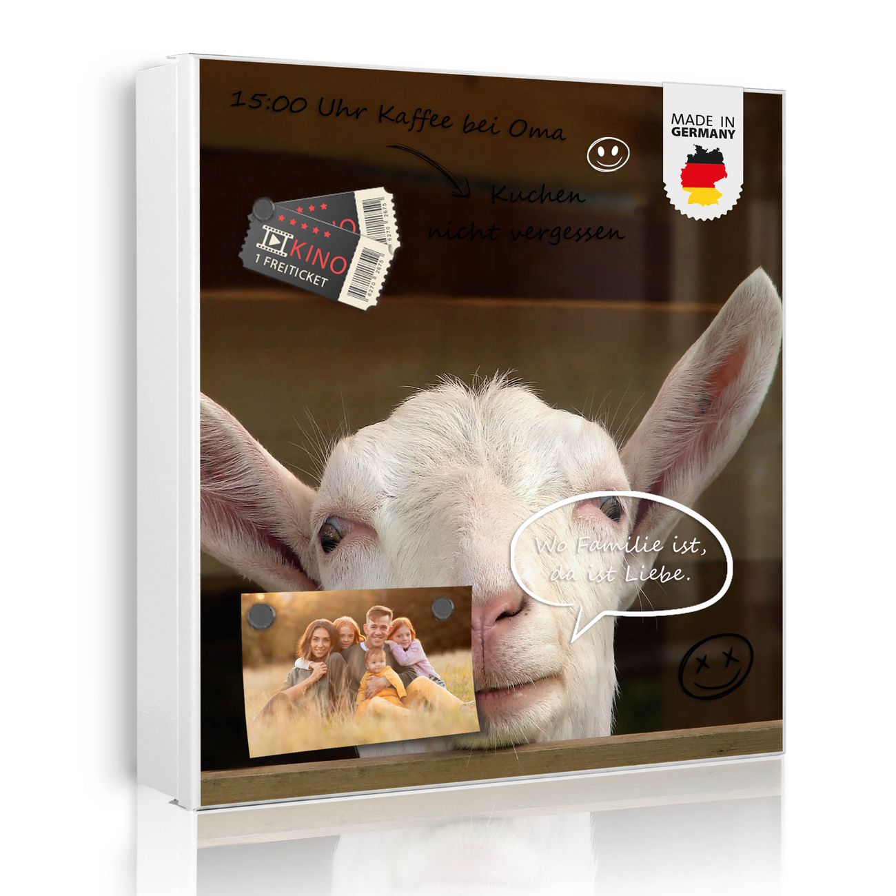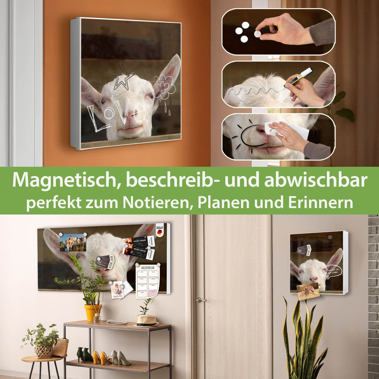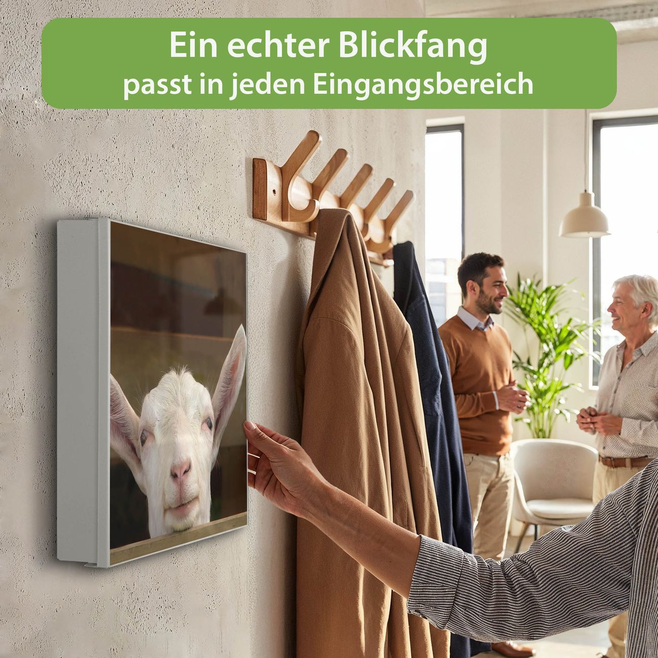 Bringe Ordnung und Eleganz in deinen Eingangsbereich mit dem banjado Schlüsselkasten Motiv Motiv Ziege. Die moderne Schlüsselbox kombiniert funktionales Design mit hochwertiger Verarbeitung und wird so zu einem echten Hingucker in Flur, Büro oder Ferienwohnung. ✅ Stilvolle Schlüsselaufbewahrung mit Motiv Motiv Ziege Der Design-Schlüsselkasten Motiv Motiv Ziege bietet Platz für bis zu 32 Schlüssel, die auf 4 stabilen Reihen mit je 8 Haken übersichtlich verstaut werden. Mit seinen kompakten Maßen von 30 x 30 x 5 cm passt die Schlüsselbox perfekt auch in kleinere Räume. Der weiß lackierte Stahlkorpus mit links angeschlagenem Türscharnier harmoniert mit gedruckten Folie auf der Front und fügt sich nahtlos in jedes Wohnambiente ein. Ob als Schlüsselorganizer für Zuhause oder als praktische Lösung für Büros, Praxen und Gewerbe, der banjado Schlüsselkasten sorgt für Ordnung und Übersicht. Dank der magnetischen, mit Kreidestiften beschreibbaren Folie auf der Front kannst du Notizen anheften oder Termine direkt auf der Oberfläche festhalten. Die Schlüsselbox Motiv Motiv Ziege zur Wandmontage wird inklusive Befestigungsmaterial geliefert und ist schnell angebracht. So hast du deine Schlüssel jederzeit griffbereit und zugleich stilvoll verstaut. Mit diesem banjado Schlüsselkasten Motiv Motiv Ziege kombinierst du praktische Aufbewahrung mit stilvollem Wohndesign. Ob privat oder geschäftlich, die Schlüsselbox sorgt für mehr Ordnung, Übersicht und ein wohnliches Ambiente.Vorteile im Überblick