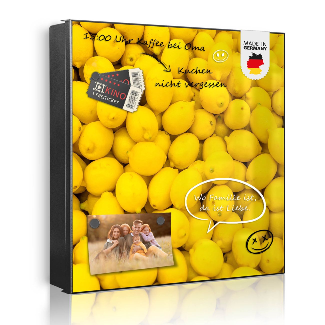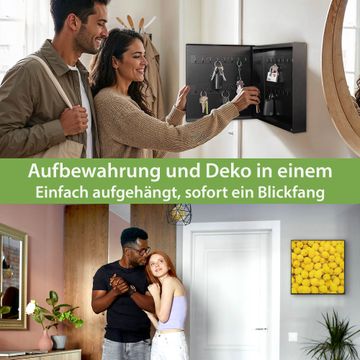 Bringe Ordnung und Eleganz in deinen Eingangsbereich mit dem banjado Schlüsselkasten Motiv Motiv Zitronen. Die moderne Schlüsselbox kombiniert funktionales Design mit hochwertiger Verarbeitung und wird so zu einem echten Hingucker in Flur, Büro oder Ferienwohnung. ✅ Stilvolle Schlüsselaufbewahrung mit Motiv Motiv Zitronen Der Design-Schlüsselkasten Motiv Motiv Zitronen bietet Platz für bis zu 32 Schlüssel, die auf 4 stabilen Reihen mit je 8 Haken übersichtlich verstaut werden. Mit seinen kompakten Maßen von 30 x 30 x 5 cm passt die Schlüsselbox perfekt auch in kleinere Räume. Der schwarz lackierte Stahlkorpus mit links angeschlagenem Türscharnier harmoniert mit gedruckten Folie auf der Front und fügt sich nahtlos in jedes Wohnambiente ein. Ob als Schlüsselorganizer für Zuhause oder als praktische Lösung für Büros, Praxen und Gewerbe, der banjado Schlüsselkasten sorgt für Ordnung und Übersicht. Dank der magnetischen, mit Kreidestiften beschreibbaren Folie auf der Front kannst du Notizen anheften oder Termine direkt auf der Oberfläche festhalten. Die Schlüsselbox Motiv Motiv Zitronen zur Wandmontage wird inklusive Befestigungsmaterial geliefert und ist schnell angebracht. So hast du deine Schlüssel jederzeit griffbereit und zugleich stilvoll verstaut. Mit diesem banjado Schlüsselkasten Motiv Motiv Zitronen kombinierst du praktische Aufbewahrung mit stilvollem Wohndesign. Ob privat oder geschäftlich, die Schlüsselbox sorgt für mehr Ordnung, Übersicht und ein wohnliches Ambiente.Vorteile im Überblick