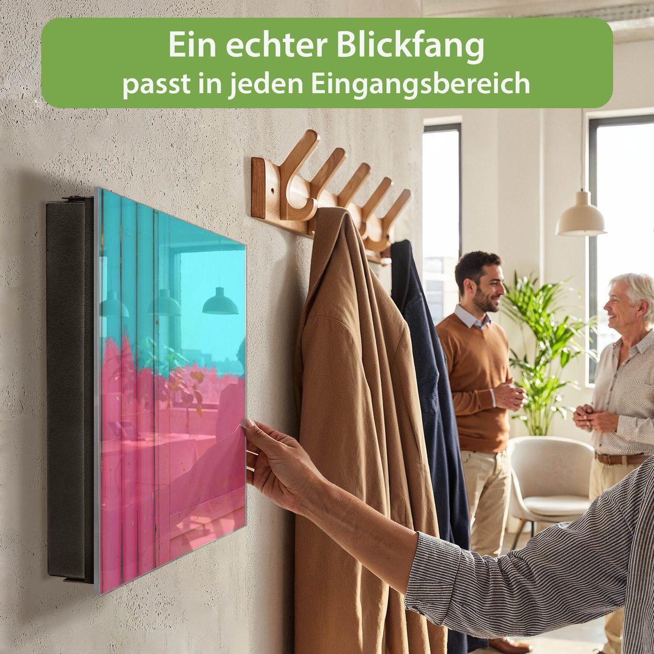 Bringe Ordnung und Eleganz in deinen Eingangsbereich mit dem banjado Schlüsselkasten Motiv Motiv Zwei Farben. Die moderne Schlüsselbox kombiniert funktionales Design mit hochwertiger Verarbeitung und wird so zu einem echten Hingucker in Flur, Büro oder Ferienwohnung. ✅ Stilvolle Schlüsselaufbewahrung mit Glasfront im Motiv Motiv Zwei Farben Der Design-Schlüsselkasten Motiv Motiv Zwei Farben bietet Platz für bis zu 50 Schlüssel, die auf 5 stabilen Reihen mit je 10 Haken übersichtlich verstaut werden. Mit seinen kompakten Maßen von 30 x 30 x 5 cm passt die Schlüsselbox perfekt auch in kleinere Räume. Der schwarz lackierte Stahlkorpus mit rechts angeschlagenem Türscharnier harmoniert mit der Glasfront und fügt sich nahtlos in jedes Wohnambiente ein. Ob als Schlüsselorganizer für Zuhause oder als praktische Lösung für Büros, Praxen und Gewerbe, der banjado Schlüsselkasten sorgt für Ordnung und Übersicht. Dank der magnetischen, mit Kreidestiften beschreibbaren Glasfront kannst du Notizen anheften oder Termine direkt auf der Oberfläche festhalten. Die Schlüsselbox Motiv Motiv Zwei Farben zur Wandmontage wird inklusive Befestigungsmaterial geliefert und ist schnell angebracht. So hast du deine Schlüssel jederzeit griffbereit und zugleich stilvoll verstaut. Mit diesem banjado Schlüsselkasten Motiv Motiv Zwei Farben kombinierst du praktische Aufbewahrung mit stilvollem Wohndesign. Ob privat oder geschäftlich, die Schlüsselbox sorgt für mehr Ordnung, Übersicht und ein wohnliches Ambiente.Vorteile im Überblick