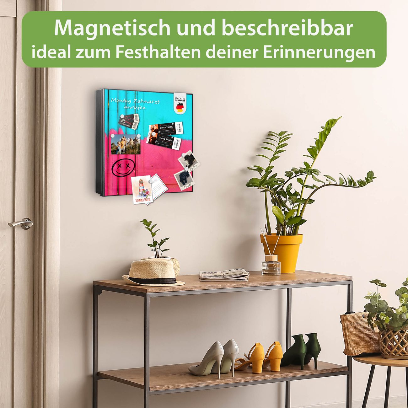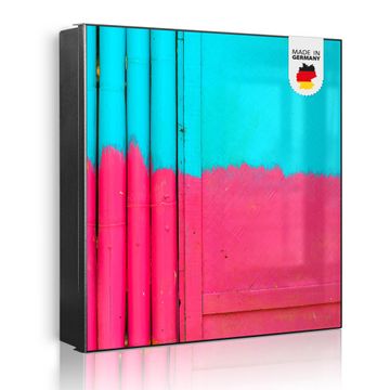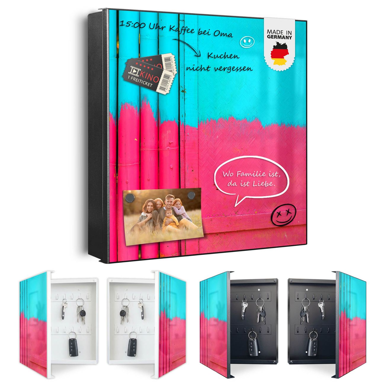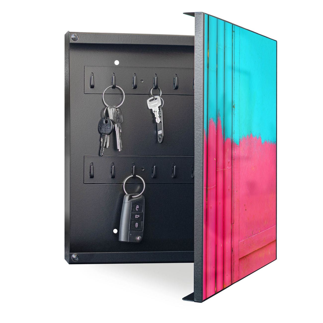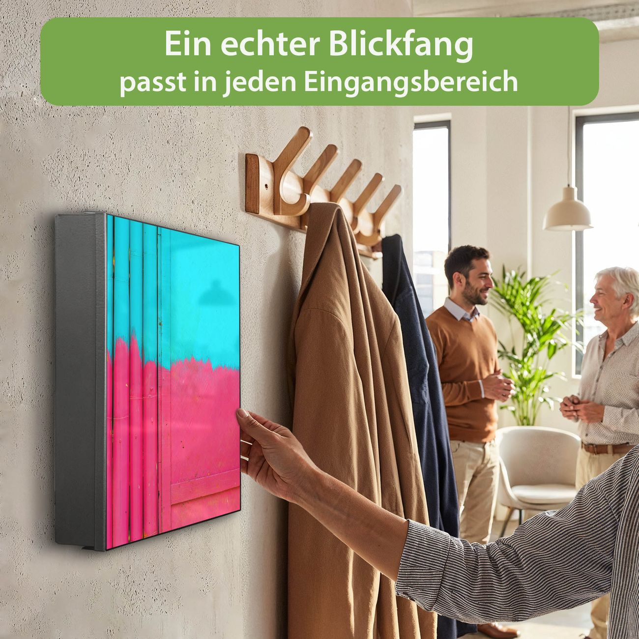 Bringe Ordnung und Eleganz in deinen Eingangsbereich mit dem banjado Schlüsselkasten Motiv Motiv Zwei Farben. Die moderne Schlüsselbox kombiniert funktionales Design mit hochwertiger Verarbeitung und wird so zu einem echten Hingucker in Flur, Büro oder Ferienwohnung. ✅ Stilvolle Schlüsselaufbewahrung mit Motiv Motiv Zwei Farben Der Design-Schlüsselkasten Motiv Motiv Zwei Farben bietet Platz für bis zu 32 Schlüssel, die auf 4 stabilen Reihen mit je 8 Haken übersichtlich verstaut werden. Mit seinen kompakten Maßen von 30 x 30 x 5 cm passt die Schlüsselbox perfekt auch in kleinere Räume. Der schwarz lackierte Stahlkorpus mit rechts angeschlagenem Türscharnier harmoniert mit gedruckten Folie auf der Front und fügt sich nahtlos in jedes Wohnambiente ein. Ob als Schlüsselorganizer für Zuhause oder als praktische Lösung für Büros, Praxen und Gewerbe, der banjado Schlüsselkasten sorgt für Ordnung und Übersicht. Dank der magnetischen, mit Kreidestiften beschreibbaren Folie auf der Front kannst du Notizen anheften oder Termine direkt auf der Oberfläche festhalten. Die Schlüsselbox Motiv Motiv Zwei Farben zur Wandmontage wird inklusive Befestigungsmaterial geliefert und ist schnell angebracht. So hast du deine Schlüssel jederzeit griffbereit und zugleich stilvoll verstaut. Mit diesem banjado Schlüsselkasten Motiv Motiv Zwei Farben kombinierst du praktische Aufbewahrung mit stilvollem Wohndesign. Ob privat oder geschäftlich, die Schlüsselbox sorgt für mehr Ordnung, Übersicht und ein wohnliches Ambiente.Vorteile im Überblick