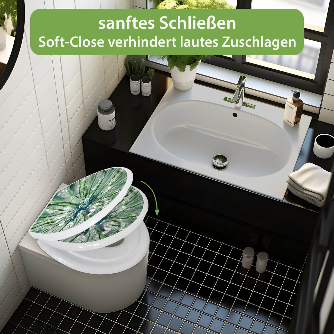 FUNKTION:Mit dem banjado Familien WC Sitz mit Absenkautomatik und dem Motiv Motiv Blüte Mit Tautropfen verbinden Sie Design mit Funktionalität. Sie erhalten den Toilettendeckel in bewährt guter Qualität mit Montagematerial passend auf alle Euro-WC-Becken. Die Gesamtgröße beträgt 37,1cm x 44,9cm x 5cm, die Grundfarbe ist weiß.</p> DESIGN:Der Klodeckel in weiß mit Motiv Motiv Blüte Mit Tautropfen hat eine ansprechende Optik, eine besondere Form und ist sehr stabil. Das Motiv besteht aus einer farbbrillianten Motivfolie, die durch ein Schutzlaminat zusätzlich vor Kratzern schützt. Der integrierte Kindersitz fügt sich harmonisch ein. DETAILS:Der Toilettensitz mit Soft Close besteht aus hochwertigem Polypropylen, ist geruchlos, ungiftig und kann mit handelsüblicher Seife gereinigt werden. Die Montage kann von von oben oder von unten erfolgen und ist kinderleicht. NUTZEN:Mit Hilfe der detaillierten Aufbauanleitung ermöglichen wir eine schnelle und unkomplizierte Montage. Die banjado Klobrille ist universell geeignet für alle Euro-WC-Schüsseln. Der Kindersitz kann unkompliziert entfernt werden. BANJADO:Ihr WC-Deckel wird in Sachsen in einer kleinen Manufaktur von Hand veredelt. Die Motivfolie ist lösungsmittelfrei und schutzlaminiert für einen langen Halt. Wir wünschen viel Freude bei der Auswahl eines schönen Motivs.