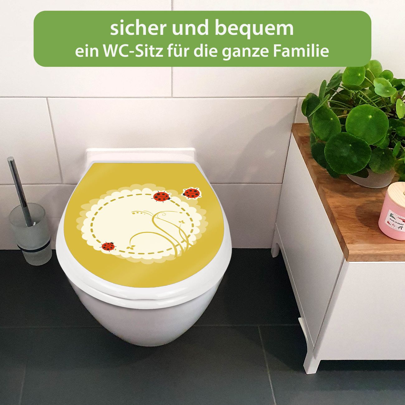 FUNKTION:Mit dem banjado Familien WC Sitz mit Absenkautomatik und dem Motiv Motiv Drei Marienkäfer verbinden Sie Design mit Funktionalität. Sie erhalten den Toilettendeckel in bewährt guter Qualität mit Montagematerial passend auf alle Euro-WC-Becken. Die Gesamtgröße beträgt 37,1cm x 44,9cm x 5cm, die Grundfarbe ist weiß.</p> DESIGN:Der Klodeckel in weiß mit Motiv Motiv Drei Marienkäfer hat eine ansprechende Optik, eine besondere Form und ist sehr stabil. Das Motiv besteht aus einer farbbrillianten Motivfolie, die durch ein Schutzlaminat zusätzlich vor Kratzern schützt. Der integrierte Kindersitz fügt sich harmonisch ein. DETAILS:Der Toilettensitz mit Soft Close besteht aus hochwertigem Polypropylen, ist geruchlos, ungiftig und kann mit handelsüblicher Seife gereinigt werden. Die Montage kann von von oben oder von unten erfolgen und ist kinderleicht. NUTZEN:Mit Hilfe der detaillierten Aufbauanleitung ermöglichen wir eine schnelle und unkomplizierte Montage. Die banjado Klobrille ist universell geeignet für alle Euro-WC-Schüsseln. Der Kindersitz kann unkompliziert entfernt werden. BANJADO:Ihr WC-Deckel wird in Sachsen in einer kleinen Manufaktur von Hand veredelt. Die Motivfolie ist lösungsmittelfrei und schutzlaminiert für einen langen Halt. Wir wünschen viel Freude bei der Auswahl eines schönen Motivs.