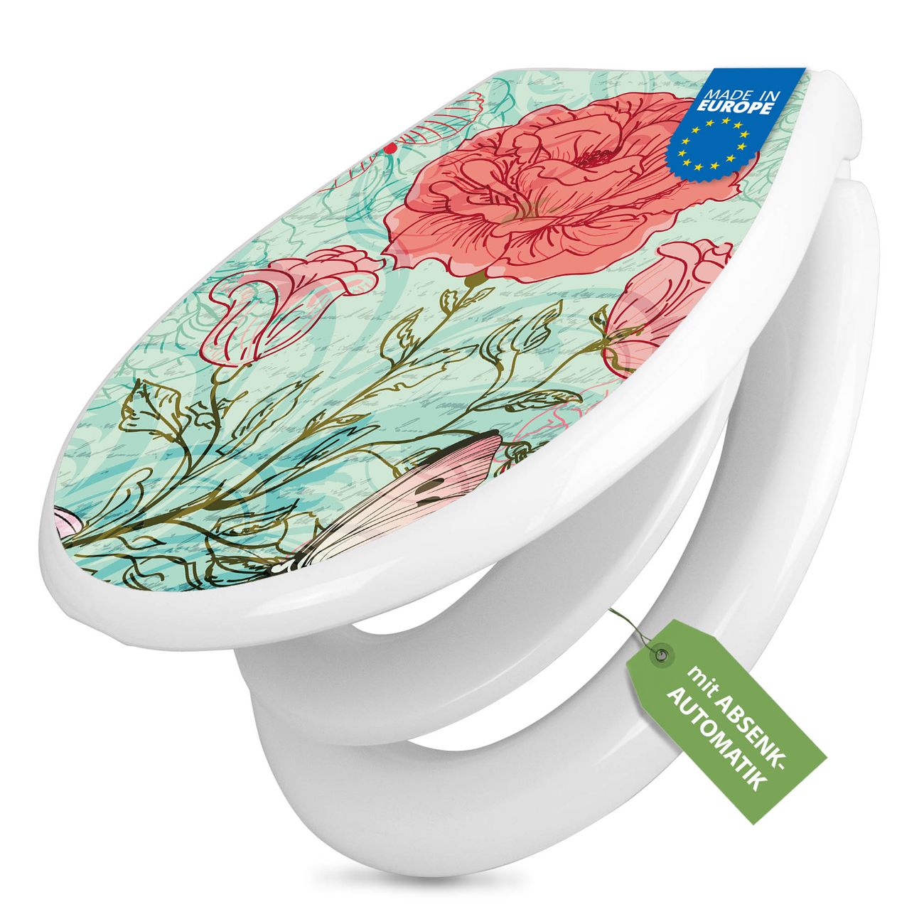 FUNKTION:Mit dem banjado Familien WC Sitz mit Absenkautomatik und dem Motiv Motiv Eine Rose Ist Eine Rose verbinden Sie Design mit Funktionalität. Sie erhalten den Toilettendeckel in bewährt guter Qualität mit Montagematerial passend auf alle Euro-WC-Becken. Die Gesamtgröße beträgt 37,1cm x 44,9cm x 5cm, die Grundfarbe ist weiß.</p> DESIGN:Der Klodeckel in weiß mit Motiv Motiv Eine Rose Ist Eine Rose hat eine ansprechende Optik, eine besondere Form und ist sehr stabil. Das Motiv besteht aus einer farbbrillianten Motivfolie, die durch ein Schutzlaminat zusätzlich vor Kratzern schützt. Der integrierte Kindersitz fügt sich harmonisch ein. DETAILS:Der Toilettensitz mit Soft Close besteht aus hochwertigem Polypropylen, ist geruchlos, ungiftig und kann mit handelsüblicher Seife gereinigt werden. Die Montage kann von von oben oder von unten erfolgen und ist kinderleicht. NUTZEN:Mit Hilfe der detaillierten Aufbauanleitung ermöglichen wir eine schnelle und unkomplizierte Montage. Die banjado Klobrille ist universell geeignet für alle Euro-WC-Schüsseln. Der Kindersitz kann unkompliziert entfernt werden. BANJADO:Ihr WC-Deckel wird in Sachsen in einer kleinen Manufaktur von Hand veredelt. Die Motivfolie ist lösungsmittelfrei und schutzlaminiert für einen langen Halt. Wir wünschen viel Freude bei der Auswahl eines schönen Motivs.