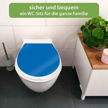 FUNKTION:Mit dem banjado Familien WC Sitz mit Absenkautomatik und dem Motiv Farbe Signalblau verbinden Sie Design mit Funktionalität. Sie erhalten den Toilettendeckel in bewährt guter Qualität mit Montagematerial passend auf alle Euro-WC-Becken. Die Gesamtgröße beträgt 37,1cm x 44,9cm x 5cm, die Grundfarbe ist weiß.</p> DESIGN:Der Klodeckel in weiß mit Motiv Farbe Signalblau hat eine ansprechende Optik, eine besondere Form und ist sehr stabil. Das Motiv besteht aus einer farbbrillianten Motivfolie, die durch ein Schutzlaminat zusätzlich vor Kratzern schützt. Der integrierte Kindersitz fügt sich harmonisch ein. DETAILS:Der Toilettensitz mit Soft Close besteht aus hochwertigem Polypropylen, ist geruchlos, ungiftig und kann mit handelsüblicher Seife gereinigt werden. Die Montage kann von von oben oder von unten erfolgen und ist kinderleicht. NUTZEN:Mit Hilfe der detaillierten Aufbauanleitung ermöglichen wir eine schnelle und unkomplizierte Montage. Die banjado Klobrille ist universell geeignet für alle Euro-WC-Schüsseln. Der Kindersitz kann unkompliziert entfernt werden. BANJADO:Ihr WC-Deckel wird in Sachsen in einer kleinen Manufaktur von Hand veredelt. Die Motivfolie ist lösungsmittelfrei und schutzlaminiert für einen langen Halt. Wir wünschen viel Freude bei der Auswahl eines schönen Motivs.