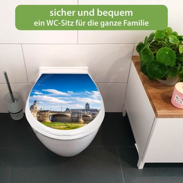 FUNKTION:Mit dem banjado Familien WC Sitz mit Absenkautomatik und dem Motiv Motiv Elbflorenz verbinden Sie Design mit Funktionalität. Sie erhalten den Toilettendeckel in bewährt guter Qualität mit Montagematerial passend auf alle Euro-WC-Becken. Die Gesamtgröße beträgt 37,1cm x 44,9cm x 5cm, die Grundfarbe ist weiß.</p> DESIGN:Der Klodeckel in weiß mit Motiv Motiv Elbflorenz hat eine ansprechende Optik, eine besondere Form und ist sehr stabil. Das Motiv besteht aus einer farbbrillianten Motivfolie, die durch ein Schutzlaminat zusätzlich vor Kratzern schützt. Der integrierte Kindersitz fügt sich harmonisch ein. DETAILS:Der Toilettensitz mit Soft Close besteht aus hochwertigem Polypropylen, ist geruchlos, ungiftig und kann mit handelsüblicher Seife gereinigt werden. Die Montage kann von von oben oder von unten erfolgen und ist kinderleicht. NUTZEN:Mit Hilfe der detaillierten Aufbauanleitung ermöglichen wir eine schnelle und unkomplizierte Montage. Die banjado Klobrille ist universell geeignet für alle Euro-WC-Schüsseln. Der Kindersitz kann unkompliziert entfernt werden. BANJADO:Ihr WC-Deckel wird in Sachsen in einer kleinen Manufaktur von Hand veredelt. Die Motivfolie ist lösungsmittelfrei und schutzlaminiert für einen langen Halt. Wir wünschen viel Freude bei der Auswahl eines schönen Motivs.