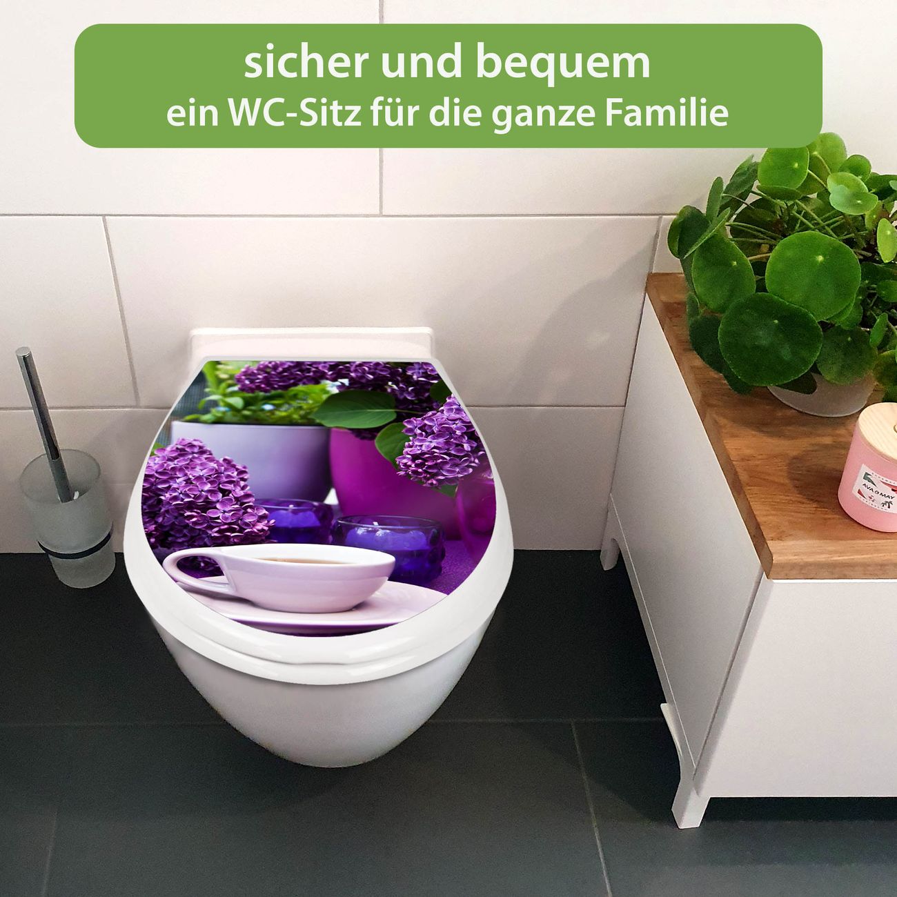 FUNKTION:Mit dem banjado Familien WC Sitz mit Absenkautomatik und dem Motiv Motiv Flieder verbinden Sie Design mit Funktionalität. Sie erhalten den Toilettendeckel in bewährt guter Qualität mit Montagematerial passend auf alle Euro-WC-Becken. Die Gesamtgröße beträgt 37,1cm x 44,9cm x 5cm, die Grundfarbe ist weiß.</p> DESIGN:Der Klodeckel in weiß mit Motiv Motiv Flieder hat eine ansprechende Optik, eine besondere Form und ist sehr stabil. Das Motiv besteht aus einer farbbrillianten Motivfolie, die durch ein Schutzlaminat zusätzlich vor Kratzern schützt. Der integrierte Kindersitz fügt sich harmonisch ein. DETAILS:Der Toilettensitz mit Soft Close besteht aus hochwertigem Polypropylen, ist geruchlos, ungiftig und kann mit handelsüblicher Seife gereinigt werden. Die Montage kann von von oben oder von unten erfolgen und ist kinderleicht. NUTZEN:Mit Hilfe der detaillierten Aufbauanleitung ermöglichen wir eine schnelle und unkomplizierte Montage. Die banjado Klobrille ist universell geeignet für alle Euro-WC-Schüsseln. Der Kindersitz kann unkompliziert entfernt werden. BANJADO:Ihr WC-Deckel wird in Sachsen in einer kleinen Manufaktur von Hand veredelt. Die Motivfolie ist lösungsmittelfrei und schutzlaminiert für einen langen Halt. Wir wünschen viel Freude bei der Auswahl eines schönen Motivs.