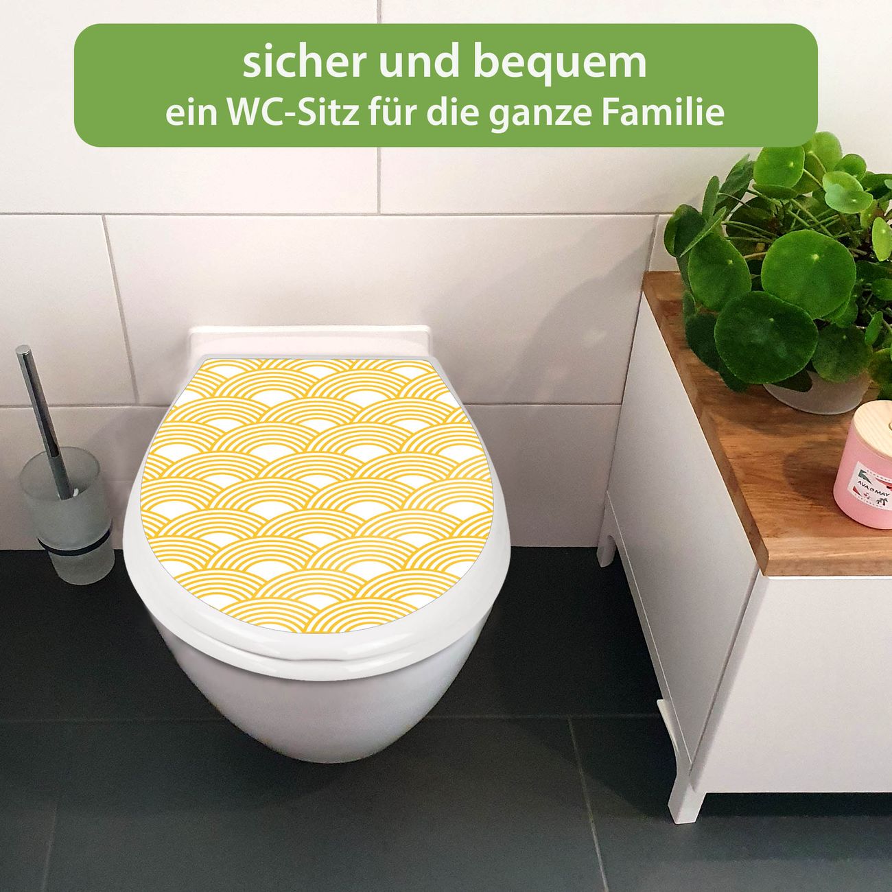 FUNKTION:Mit dem banjado Familien WC Sitz mit Absenkautomatik und dem Motiv Motiv Gelbe Wellen verbinden Sie Design mit Funktionalität. Sie erhalten den Toilettendeckel in bewährt guter Qualität mit Montagematerial passend auf alle Euro-WC-Becken. Die Gesamtgröße beträgt 37,1cm x 44,9cm x 5cm, die Grundfarbe ist weiß.</p> DESIGN:Der Klodeckel in weiß mit Motiv Motiv Gelbe Wellen hat eine ansprechende Optik, eine besondere Form und ist sehr stabil. Das Motiv besteht aus einer farbbrillianten Motivfolie, die durch ein Schutzlaminat zusätzlich vor Kratzern schützt. Der integrierte Kindersitz fügt sich harmonisch ein. DETAILS:Der Toilettensitz mit Soft Close besteht aus hochwertigem Polypropylen, ist geruchlos, ungiftig und kann mit handelsüblicher Seife gereinigt werden. Die Montage kann von von oben oder von unten erfolgen und ist kinderleicht. NUTZEN:Mit Hilfe der detaillierten Aufbauanleitung ermöglichen wir eine schnelle und unkomplizierte Montage. Die banjado Klobrille ist universell geeignet für alle Euro-WC-Schüsseln. Der Kindersitz kann unkompliziert entfernt werden. BANJADO:Ihr WC-Deckel wird in Sachsen in einer kleinen Manufaktur von Hand veredelt. Die Motivfolie ist lösungsmittelfrei und schutzlaminiert für einen langen Halt. Wir wünschen viel Freude bei der Auswahl eines schönen Motivs.