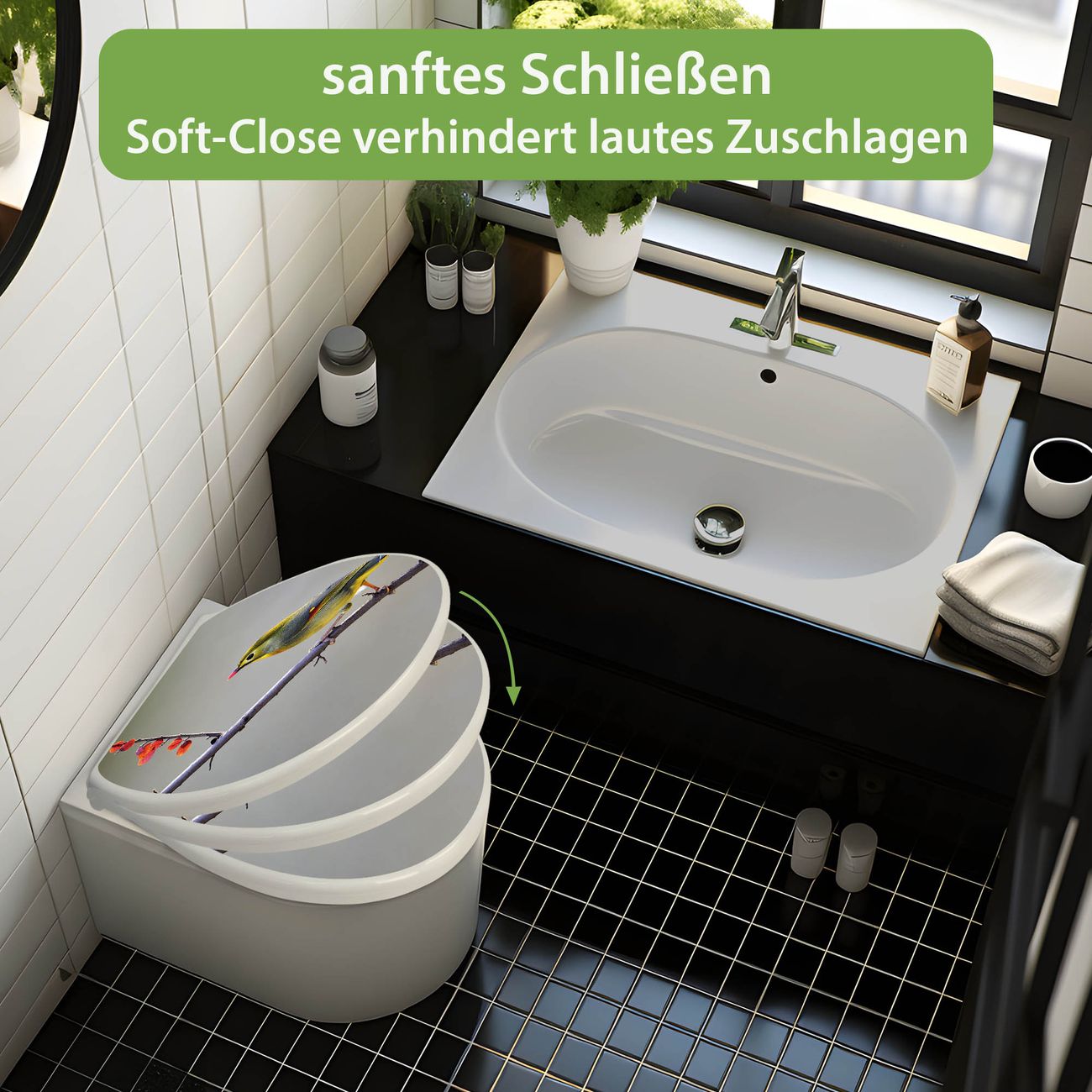 - Material: WC-Sitz und Deckel aus robustem Duroplast