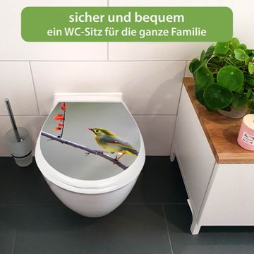 FUNKTION:Mit dem banjado Familien WC Sitz mit Absenkautomatik und dem Motiv Motiv Herbst Vogel verbinden Sie Design mit Funktionalität. Sie erhalten den Toilettendeckel in bewährt guter Qualität mit Montagematerial passend auf alle Euro-WC-Becken. Die Gesamtgröße beträgt 37,1cm x 44,9cm x 5cm, die Grundfarbe ist weiß.</p> DESIGN:Der Klodeckel in weiß mit Motiv Motiv Herbst Vogel hat eine ansprechende Optik, eine besondere Form und ist sehr stabil. Das Motiv besteht aus einer farbbrillianten Motivfolie, die durch ein Schutzlaminat zusätzlich vor Kratzern schützt. Der integrierte Kindersitz fügt sich harmonisch ein. DETAILS:Der Toilettensitz mit Soft Close besteht aus hochwertigem Polypropylen, ist geruchlos, ungiftig und kann mit handelsüblicher Seife gereinigt werden. Die Montage kann von von oben oder von unten erfolgen und ist kinderleicht. NUTZEN:Mit Hilfe der detaillierten Aufbauanleitung ermöglichen wir eine schnelle und unkomplizierte Montage. Die banjado Klobrille ist universell geeignet für alle Euro-WC-Schüsseln. Der Kindersitz kann unkompliziert entfernt werden. BANJADO:Ihr WC-Deckel wird in Sachsen in einer kleinen Manufaktur von Hand veredelt. Die Motivfolie ist lösungsmittelfrei und schutzlaminiert für einen langen Halt. Wir wünschen viel Freude bei der Auswahl eines schönen Motivs.