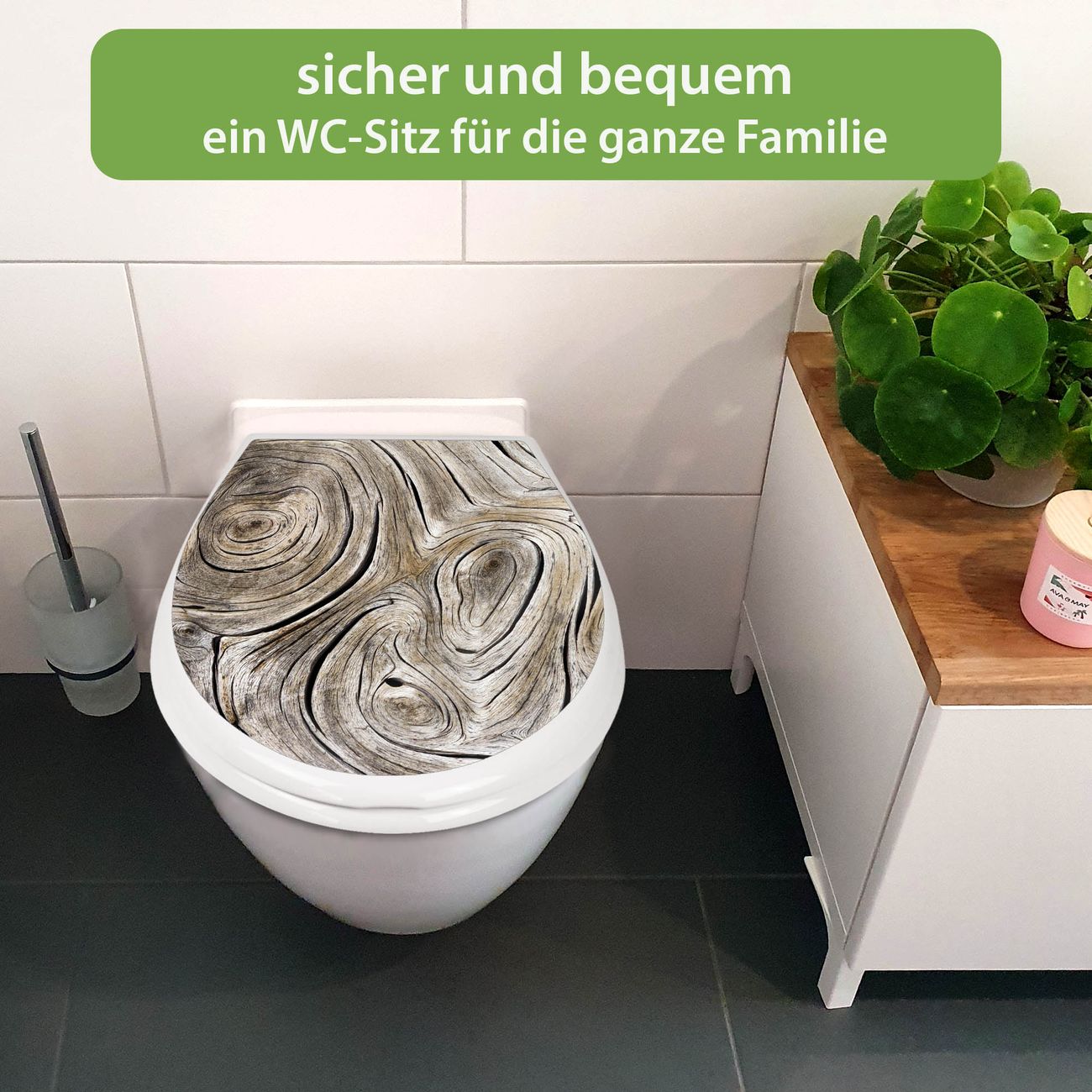 FUNKTION:Mit dem banjado Familien WC Sitz mit Absenkautomatik und dem Motiv Motiv Holzwirbel verbinden Sie Design mit Funktionalität. Sie erhalten den Toilettendeckel in bewährt guter Qualität mit Montagematerial passend auf alle Euro-WC-Becken. Die Gesamtgröße beträgt 37,1cm x 44,9cm x 5cm, die Grundfarbe ist weiß.</p> DESIGN:Der Klodeckel in weiß mit Motiv Motiv Holzwirbel hat eine ansprechende Optik, eine besondere Form und ist sehr stabil. Das Motiv besteht aus einer farbbrillianten Motivfolie, die durch ein Schutzlaminat zusätzlich vor Kratzern schützt. Der integrierte Kindersitz fügt sich harmonisch ein. DETAILS:Der Toilettensitz mit Soft Close besteht aus hochwertigem Polypropylen, ist geruchlos, ungiftig und kann mit handelsüblicher Seife gereinigt werden. Die Montage kann von von oben oder von unten erfolgen und ist kinderleicht. NUTZEN:Mit Hilfe der detaillierten Aufbauanleitung ermöglichen wir eine schnelle und unkomplizierte Montage. Die banjado Klobrille ist universell geeignet für alle Euro-WC-Schüsseln. Der Kindersitz kann unkompliziert entfernt werden. BANJADO:Ihr WC-Deckel wird in Sachsen in einer kleinen Manufaktur von Hand veredelt. Die Motivfolie ist lösungsmittelfrei und schutzlaminiert für einen langen Halt. Wir wünschen viel Freude bei der Auswahl eines schönen Motivs.