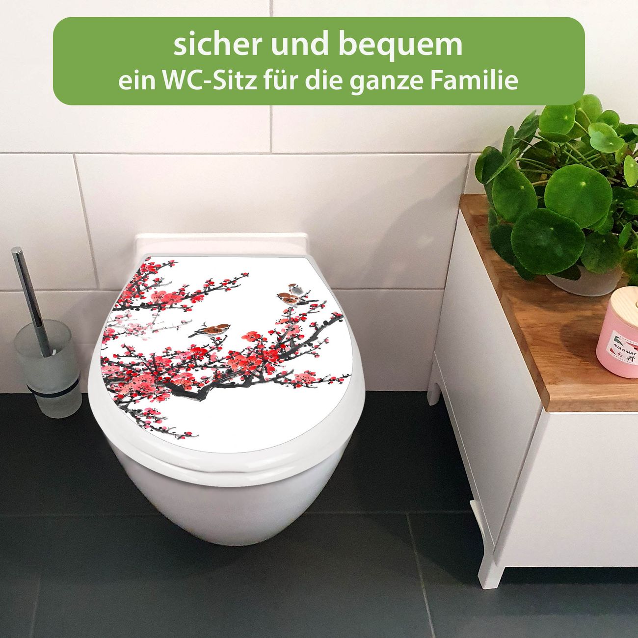FUNKTION:Mit dem banjado Familien WC Sitz mit Absenkautomatik und dem Motiv Motiv Japanische Blüten 1 verbinden Sie Design mit Funktionalität. Sie erhalten den Toilettendeckel in bewährt guter Qualität mit Montagematerial passend auf alle Euro-WC-Becken. Die Gesamtgröße beträgt 37,1cm x 44,9cm x 5cm, die Grundfarbe ist weiß.</p> DESIGN:Der Klodeckel in weiß mit Motiv Motiv Japanische Blüten 1 hat eine ansprechende Optik, eine besondere Form und ist sehr stabil. Das Motiv besteht aus einer farbbrillianten Motivfolie, die durch ein Schutzlaminat zusätzlich vor Kratzern schützt. Der integrierte Kindersitz fügt sich harmonisch ein. DETAILS:Der Toilettensitz mit Soft Close besteht aus hochwertigem Polypropylen, ist geruchlos, ungiftig und kann mit handelsüblicher Seife gereinigt werden. Die Montage kann von von oben oder von unten erfolgen und ist kinderleicht. NUTZEN:Mit Hilfe der detaillierten Aufbauanleitung ermöglichen wir eine schnelle und unkomplizierte Montage. Die banjado Klobrille ist universell geeignet für alle Euro-WC-Schüsseln. Der Kindersitz kann unkompliziert entfernt werden. BANJADO:Ihr WC-Deckel wird in Sachsen in einer kleinen Manufaktur von Hand veredelt. Die Motivfolie ist lösungsmittelfrei und schutzlaminiert für einen langen Halt. Wir wünschen viel Freude bei der Auswahl eines schönen Motivs.