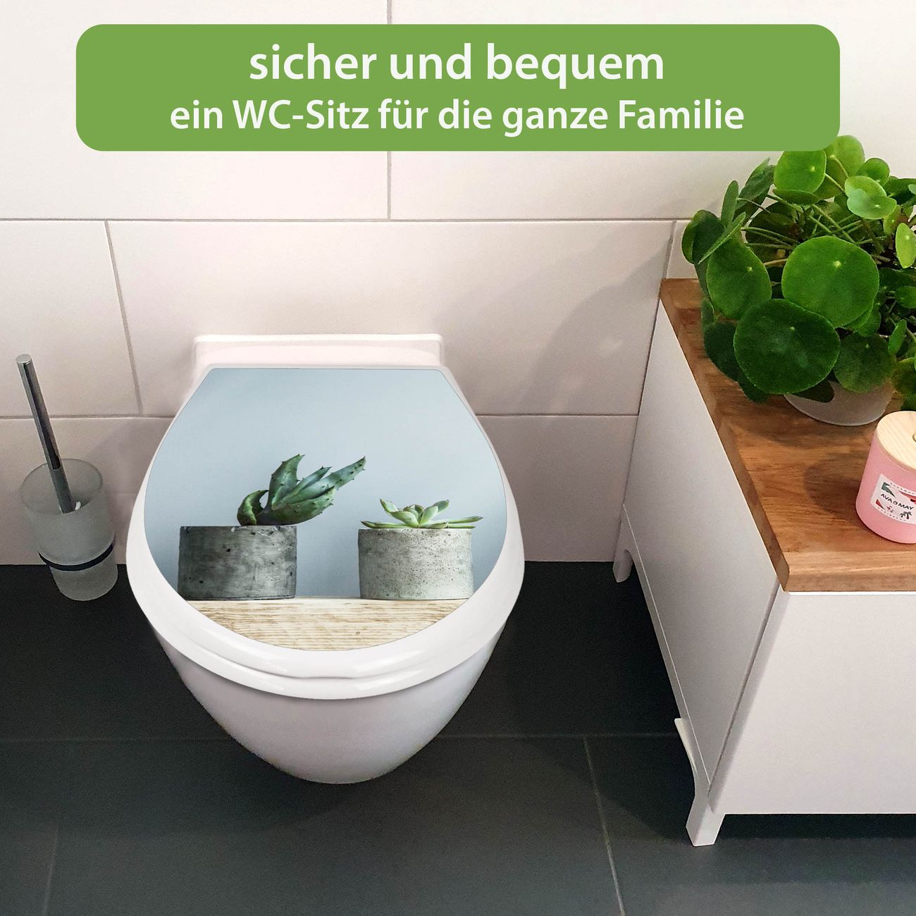 FUNKTION:Mit dem banjado Familien WC Sitz mit Absenkautomatik und dem Motiv Motiv Kakteen in Beton verbinden Sie Design mit Funktionalität. Sie erhalten den Toilettendeckel in bewährt guter Qualität mit Montagematerial passend auf alle Euro-WC-Becken. Die Gesamtgröße beträgt 37,1cm x 44,9cm x 5cm, die Grundfarbe ist weiß.</p> DESIGN:Der Klodeckel in weiß mit Motiv Motiv Kakteen in Beton hat eine ansprechende Optik, eine besondere Form und ist sehr stabil. Das Motiv besteht aus einer farbbrillianten Motivfolie, die durch ein Schutzlaminat zusätzlich vor Kratzern schützt. Der integrierte Kindersitz fügt sich harmonisch ein. DETAILS:Der Toilettensitz mit Soft Close besteht aus hochwertigem Polypropylen, ist geruchlos, ungiftig und kann mit handelsüblicher Seife gereinigt werden. Die Montage kann von von oben oder von unten erfolgen und ist kinderleicht. NUTZEN:Mit Hilfe der detaillierten Aufbauanleitung ermöglichen wir eine schnelle und unkomplizierte Montage. Die banjado Klobrille ist universell geeignet für alle Euro-WC-Schüsseln. Der Kindersitz kann unkompliziert entfernt werden. BANJADO:Ihr WC-Deckel wird in Sachsen in einer kleinen Manufaktur von Hand veredelt. Die Motivfolie ist lösungsmittelfrei und schutzlaminiert für einen langen Halt. Wir wünschen viel Freude bei der Auswahl eines schönen Motivs.