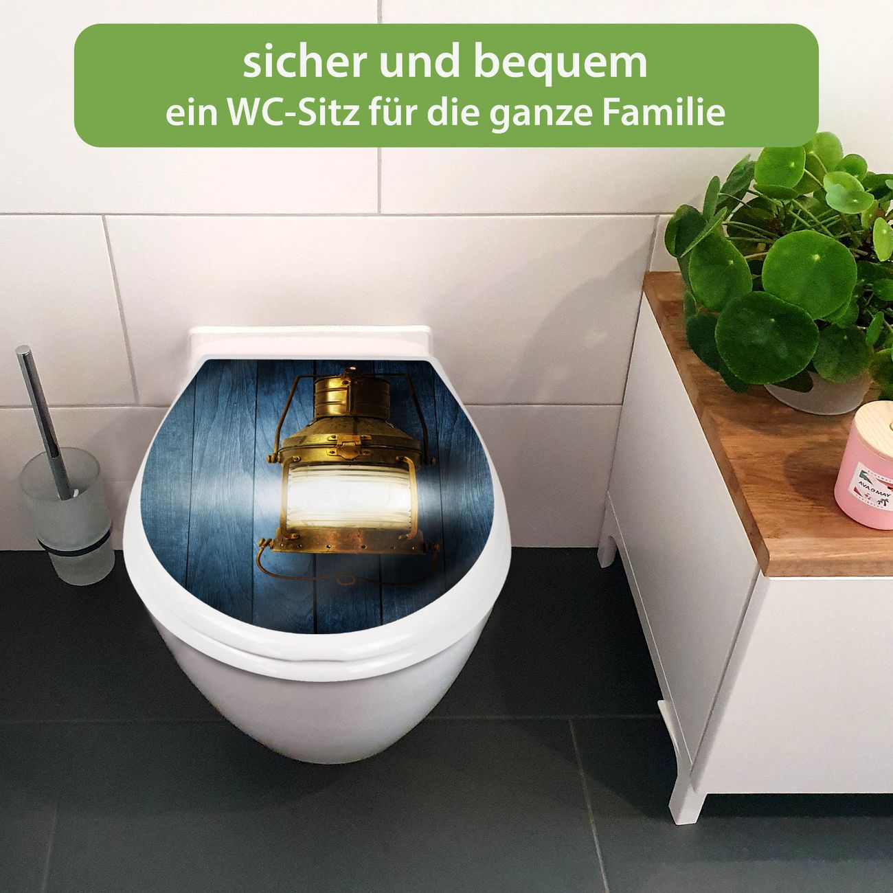FUNKTION:Mit dem banjado Familien WC Sitz mit Absenkautomatik und dem Motiv Motiv Leuchte verbinden Sie Design mit Funktionalität. Sie erhalten den Toilettendeckel in bewährt guter Qualität mit Montagematerial passend auf alle Euro-WC-Becken. Die Gesamtgröße beträgt 37,1cm x 44,9cm x 5cm, die Grundfarbe ist weiß.</p> DESIGN:Der Klodeckel in weiß mit Motiv Motiv Leuchte hat eine ansprechende Optik, eine besondere Form und ist sehr stabil. Das Motiv besteht aus einer farbbrillianten Motivfolie, die durch ein Schutzlaminat zusätzlich vor Kratzern schützt. Der integrierte Kindersitz fügt sich harmonisch ein. DETAILS:Der Toilettensitz mit Soft Close besteht aus hochwertigem Polypropylen, ist geruchlos, ungiftig und kann mit handelsüblicher Seife gereinigt werden. Die Montage kann von von oben oder von unten erfolgen und ist kinderleicht. NUTZEN:Mit Hilfe der detaillierten Aufbauanleitung ermöglichen wir eine schnelle und unkomplizierte Montage. Die banjado Klobrille ist universell geeignet für alle Euro-WC-Schüsseln. Der Kindersitz kann unkompliziert entfernt werden. BANJADO:Ihr WC-Deckel wird in Sachsen in einer kleinen Manufaktur von Hand veredelt. Die Motivfolie ist lösungsmittelfrei und schutzlaminiert für einen langen Halt. Wir wünschen viel Freude bei der Auswahl eines schönen Motivs.