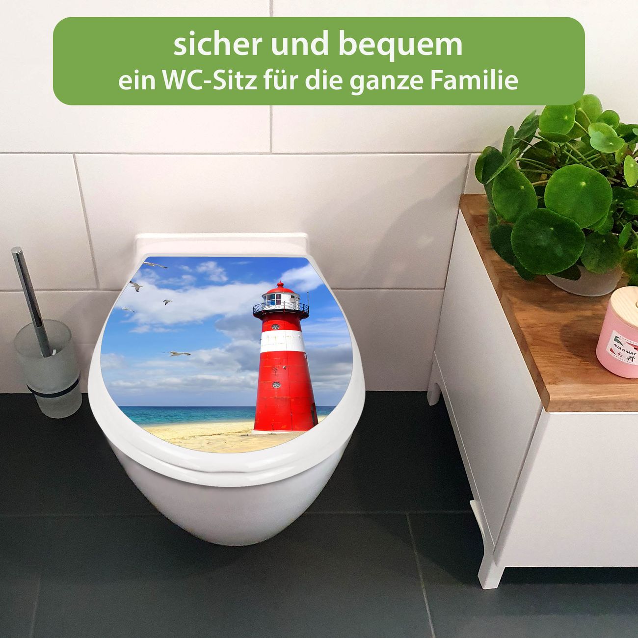 FUNKTION:Mit dem banjado Familien WC Sitz mit Absenkautomatik und dem Motiv Motiv Leuchtturm Westkapelle verbinden Sie Design mit Funktionalität. Sie erhalten den Toilettendeckel in bewährt guter Qualität mit Montagematerial passend auf alle Euro-WC-Becken. Die Gesamtgröße beträgt 37,1cm x 44,9cm x 5cm, die Grundfarbe ist weiß.</p> DESIGN:Der Klodeckel in weiß mit Motiv Motiv Leuchtturm Westkapelle hat eine ansprechende Optik, eine besondere Form und ist sehr stabil. Das Motiv besteht aus einer farbbrillianten Motivfolie, die durch ein Schutzlaminat zusätzlich vor Kratzern schützt. Der integrierte Kindersitz fügt sich harmonisch ein. DETAILS:Der Toilettensitz mit Soft Close besteht aus hochwertigem Polypropylen, ist geruchlos, ungiftig und kann mit handelsüblicher Seife gereinigt werden. Die Montage kann von von oben oder von unten erfolgen und ist kinderleicht. NUTZEN:Mit Hilfe der detaillierten Aufbauanleitung ermöglichen wir eine schnelle und unkomplizierte Montage. Die banjado Klobrille ist universell geeignet für alle Euro-WC-Schüsseln. Der Kindersitz kann unkompliziert entfernt werden. BANJADO:Ihr WC-Deckel wird in Sachsen in einer kleinen Manufaktur von Hand veredelt. Die Motivfolie ist lösungsmittelfrei und schutzlaminiert für einen langen Halt. Wir wünschen viel Freude bei der Auswahl eines schönen Motivs.