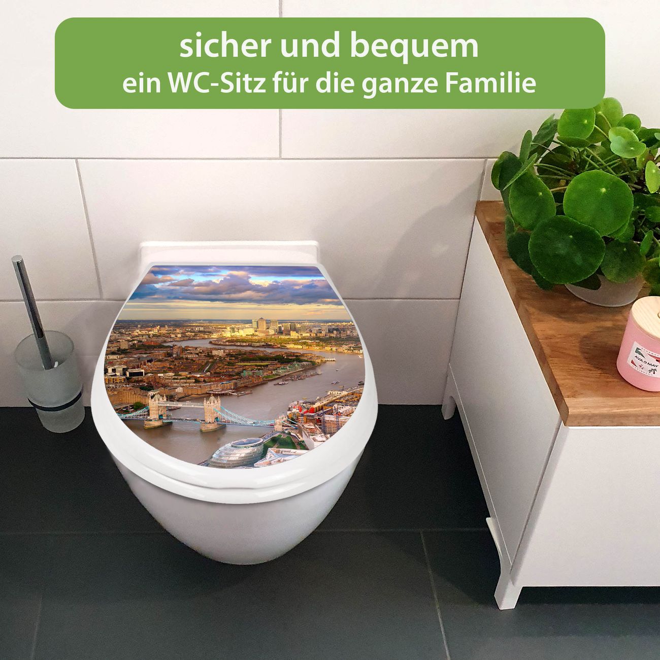 FUNKTION:Mit dem banjado Familien WC Sitz mit Absenkautomatik und dem Motiv Motiv London verbinden Sie Design mit Funktionalität. Sie erhalten den Toilettendeckel in bewährt guter Qualität mit Montagematerial passend auf alle Euro-WC-Becken. Die Gesamtgröße beträgt 37,1cm x 44,9cm x 5cm, die Grundfarbe ist weiß.</p> DESIGN:Der Klodeckel in weiß mit Motiv Motiv London hat eine ansprechende Optik, eine besondere Form und ist sehr stabil. Das Motiv besteht aus einer farbbrillianten Motivfolie, die durch ein Schutzlaminat zusätzlich vor Kratzern schützt. Der integrierte Kindersitz fügt sich harmonisch ein. DETAILS:Der Toilettensitz mit Soft Close besteht aus hochwertigem Polypropylen, ist geruchlos, ungiftig und kann mit handelsüblicher Seife gereinigt werden. Die Montage kann von von oben oder von unten erfolgen und ist kinderleicht. NUTZEN:Mit Hilfe der detaillierten Aufbauanleitung ermöglichen wir eine schnelle und unkomplizierte Montage. Die banjado Klobrille ist universell geeignet für alle Euro-WC-Schüsseln. Der Kindersitz kann unkompliziert entfernt werden. BANJADO:Ihr WC-Deckel wird in Sachsen in einer kleinen Manufaktur von Hand veredelt. Die Motivfolie ist lösungsmittelfrei und schutzlaminiert für einen langen Halt. Wir wünschen viel Freude bei der Auswahl eines schönen Motivs.