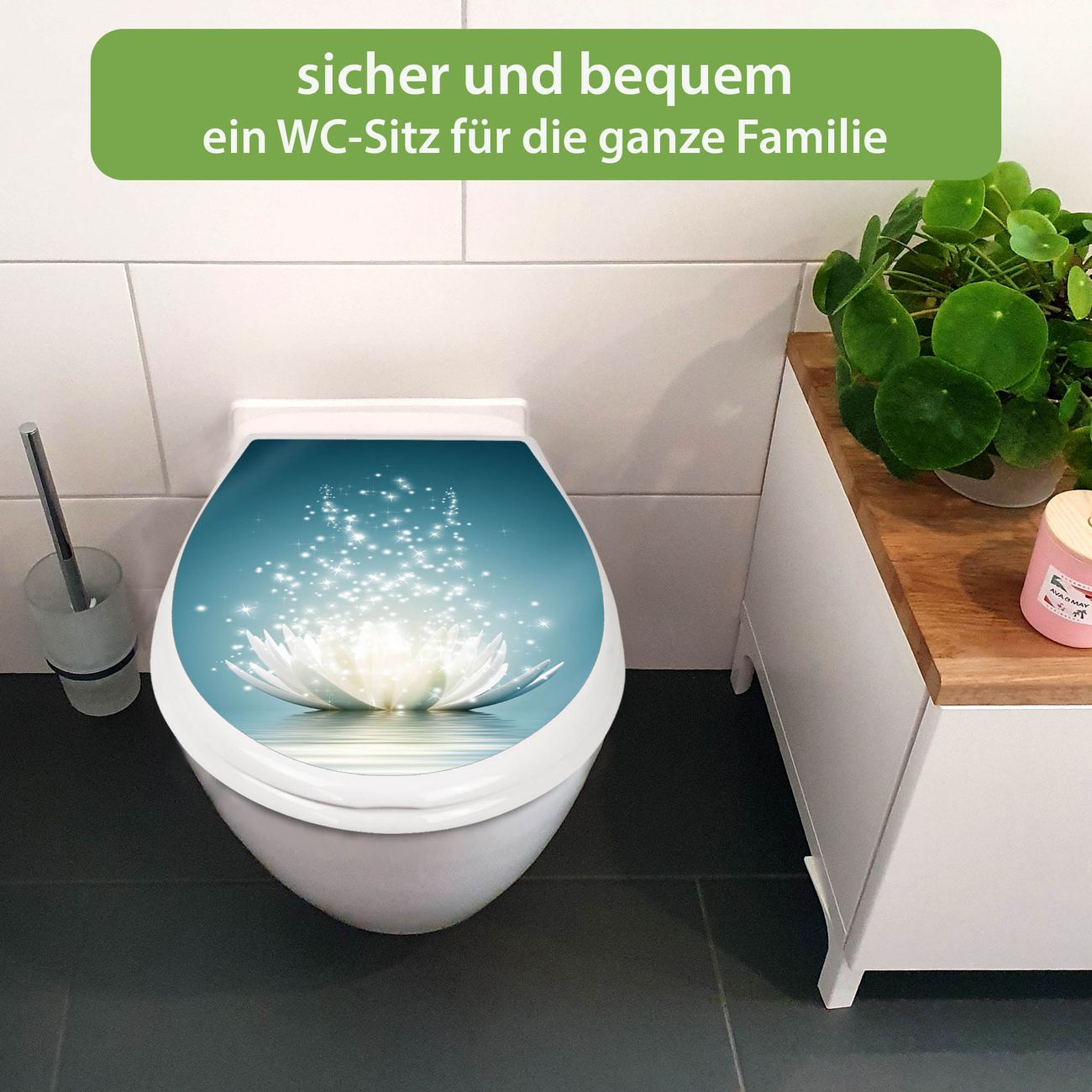 FUNKTION:Mit dem banjado Familien WC Sitz mit Absenkautomatik und dem Motiv Motiv Magische Lotusblüte verbinden Sie Design mit Funktionalität. Sie erhalten den Toilettendeckel in bewährt guter Qualität mit Montagematerial passend auf alle Euro-WC-Becken. Die Gesamtgröße beträgt 37,1cm x 44,9cm x 5cm, die Grundfarbe ist weiß.</p> DESIGN:Der Klodeckel in weiß mit Motiv Motiv Magische Lotusblüte hat eine ansprechende Optik, eine besondere Form und ist sehr stabil. Das Motiv besteht aus einer farbbrillianten Motivfolie, die durch ein Schutzlaminat zusätzlich vor Kratzern schützt. Der integrierte Kindersitz fügt sich harmonisch ein. DETAILS:Der Toilettensitz mit Soft Close besteht aus hochwertigem Polypropylen, ist geruchlos, ungiftig und kann mit handelsüblicher Seife gereinigt werden. Die Montage kann von von oben oder von unten erfolgen und ist kinderleicht. NUTZEN:Mit Hilfe der detaillierten Aufbauanleitung ermöglichen wir eine schnelle und unkomplizierte Montage. Die banjado Klobrille ist universell geeignet für alle Euro-WC-Schüsseln. Der Kindersitz kann unkompliziert entfernt werden. BANJADO:Ihr WC-Deckel wird in Sachsen in einer kleinen Manufaktur von Hand veredelt. Die Motivfolie ist lösungsmittelfrei und schutzlaminiert für einen langen Halt. Wir wünschen viel Freude bei der Auswahl eines schönen Motivs.