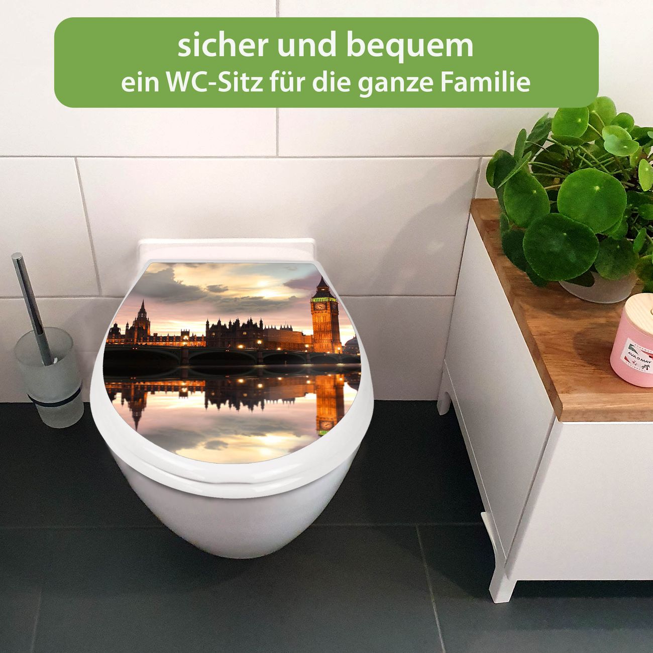FUNKTION:Mit dem banjado Familien WC Sitz mit Absenkautomatik und dem Motiv Motiv Palace of Westminster verbinden Sie Design mit Funktionalität. Sie erhalten den Toilettendeckel in bewährt guter Qualität mit Montagematerial passend auf alle Euro-WC-Becken. Die Gesamtgröße beträgt 37,1cm x 44,9cm x 5cm, die Grundfarbe ist weiß.</p> DESIGN:Der Klodeckel in weiß mit Motiv Motiv Palace of Westminster hat eine ansprechende Optik, eine besondere Form und ist sehr stabil. Das Motiv besteht aus einer farbbrillianten Motivfolie, die durch ein Schutzlaminat zusätzlich vor Kratzern schützt. Der integrierte Kindersitz fügt sich harmonisch ein. DETAILS:Der Toilettensitz mit Soft Close besteht aus hochwertigem Polypropylen, ist geruchlos, ungiftig und kann mit handelsüblicher Seife gereinigt werden. Die Montage kann von von oben oder von unten erfolgen und ist kinderleicht. NUTZEN:Mit Hilfe der detaillierten Aufbauanleitung ermöglichen wir eine schnelle und unkomplizierte Montage. Die banjado Klobrille ist universell geeignet für alle Euro-WC-Schüsseln. Der Kindersitz kann unkompliziert entfernt werden. BANJADO:Ihr WC-Deckel wird in Sachsen in einer kleinen Manufaktur von Hand veredelt. Die Motivfolie ist lösungsmittelfrei und schutzlaminiert für einen langen Halt. Wir wünschen viel Freude bei der Auswahl eines schönen Motivs.