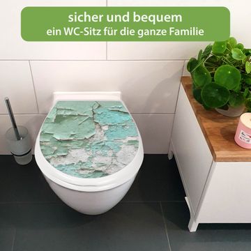 FUNKTION:Mit dem banjado Familien WC Sitz mit Absenkautomatik und dem Motiv Motiv Patina Mint verbinden Sie Design mit Funktionalität. Sie erhalten den Toilettendeckel in bewährt guter Qualität mit Montagematerial passend auf alle Euro-WC-Becken. Die Gesamtgröße beträgt 37,1cm x 44,9cm x 5cm, die Grundfarbe ist weiß.</p> DESIGN:Der Klodeckel in weiß mit Motiv Motiv Patina Mint hat eine ansprechende Optik, eine besondere Form und ist sehr stabil. Das Motiv besteht aus einer farbbrillianten Motivfolie, die durch ein Schutzlaminat zusätzlich vor Kratzern schützt. Der integrierte Kindersitz fügt sich harmonisch ein. DETAILS:Der Toilettensitz mit Soft Close besteht aus hochwertigem Polypropylen, ist geruchlos, ungiftig und kann mit handelsüblicher Seife gereinigt werden. Die Montage kann von von oben oder von unten erfolgen und ist kinderleicht. NUTZEN:Mit Hilfe der detaillierten Aufbauanleitung ermöglichen wir eine schnelle und unkomplizierte Montage. Die banjado Klobrille ist universell geeignet für alle Euro-WC-Schüsseln. Der Kindersitz kann unkompliziert entfernt werden. BANJADO:Ihr WC-Deckel wird in Sachsen in einer kleinen Manufaktur von Hand veredelt. Die Motivfolie ist lösungsmittelfrei und schutzlaminiert für einen langen Halt. Wir wünschen viel Freude bei der Auswahl eines schönen Motivs.