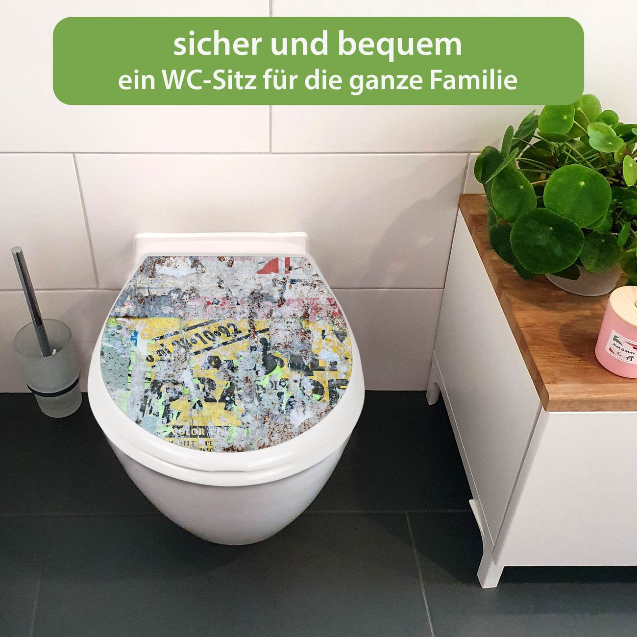 FUNKTION:Mit dem banjado Familien WC Sitz mit Absenkautomatik und dem Motiv Motiv Posterwand verbinden Sie Design mit Funktionalität. Sie erhalten den Toilettendeckel in bewährt guter Qualität mit Montagematerial passend auf alle Euro-WC-Becken. Die Gesamtgröße beträgt 37,1cm x 44,9cm x 5cm, die Grundfarbe ist weiß.</p> DESIGN:Der Klodeckel in weiß mit Motiv Motiv Posterwand hat eine ansprechende Optik, eine besondere Form und ist sehr stabil. Das Motiv besteht aus einer farbbrillianten Motivfolie, die durch ein Schutzlaminat zusätzlich vor Kratzern schützt. Der integrierte Kindersitz fügt sich harmonisch ein. DETAILS:Der Toilettensitz mit Soft Close besteht aus hochwertigem Polypropylen, ist geruchlos, ungiftig und kann mit handelsüblicher Seife gereinigt werden. Die Montage kann von von oben oder von unten erfolgen und ist kinderleicht. NUTZEN:Mit Hilfe der detaillierten Aufbauanleitung ermöglichen wir eine schnelle und unkomplizierte Montage. Die banjado Klobrille ist universell geeignet für alle Euro-WC-Schüsseln. Der Kindersitz kann unkompliziert entfernt werden. BANJADO:Ihr WC-Deckel wird in Sachsen in einer kleinen Manufaktur von Hand veredelt. Die Motivfolie ist lösungsmittelfrei und schutzlaminiert für einen langen Halt. Wir wünschen viel Freude bei der Auswahl eines schönen Motivs.