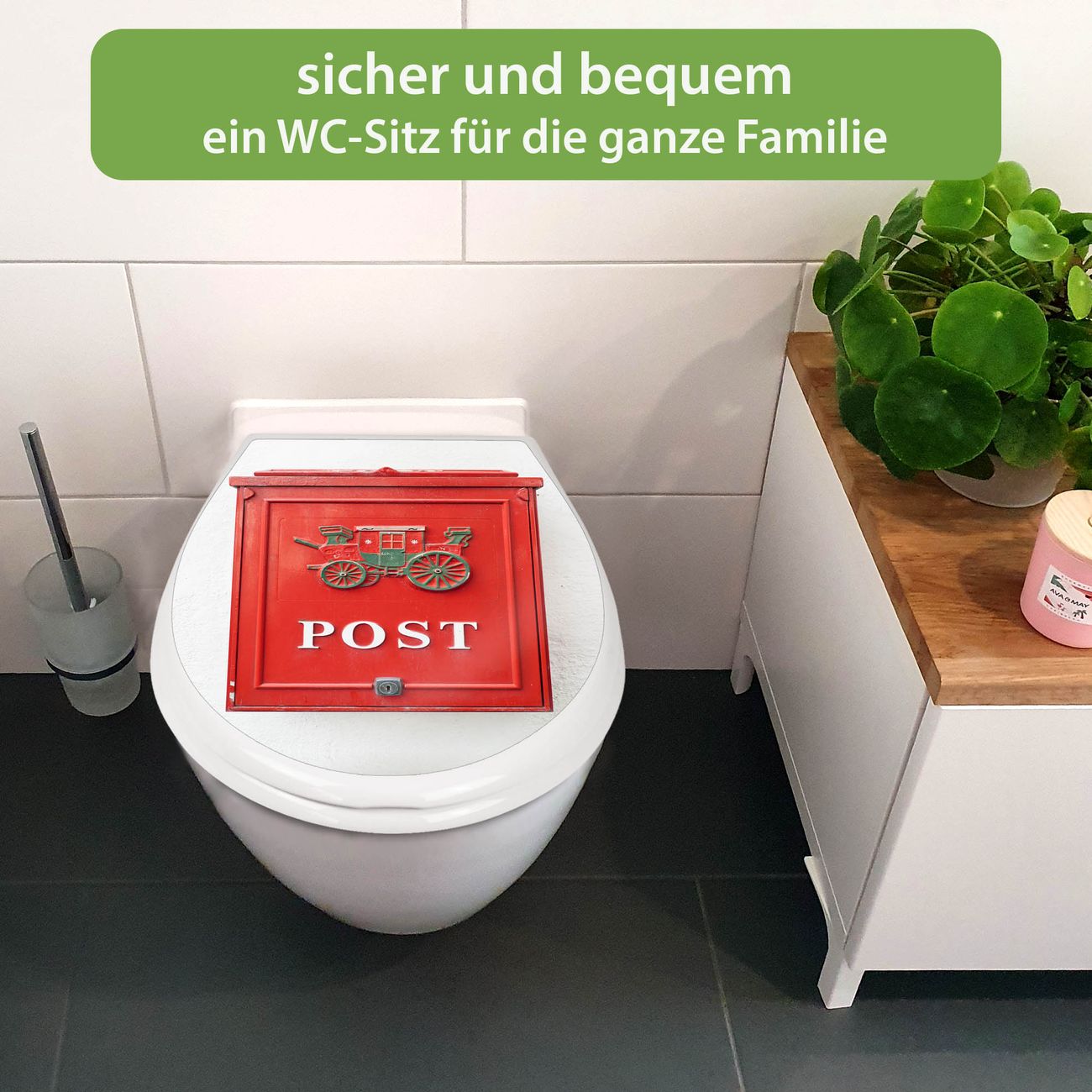 FUNKTION:Mit dem banjado Familien WC Sitz mit Absenkautomatik und dem Motiv Motiv Postkasten Nostalgie verbinden Sie Design mit Funktionalität. Sie erhalten den Toilettendeckel in bewährt guter Qualität mit Montagematerial passend auf alle Euro-WC-Becken. Die Gesamtgröße beträgt 37,1cm x 44,9cm x 5cm, die Grundfarbe ist weiß.</p> DESIGN:Der Klodeckel in weiß mit Motiv Motiv Postkasten Nostalgie hat eine ansprechende Optik, eine besondere Form und ist sehr stabil. Das Motiv besteht aus einer farbbrillianten Motivfolie, die durch ein Schutzlaminat zusätzlich vor Kratzern schützt. Der integrierte Kindersitz fügt sich harmonisch ein. DETAILS:Der Toilettensitz mit Soft Close besteht aus hochwertigem Polypropylen, ist geruchlos, ungiftig und kann mit handelsüblicher Seife gereinigt werden. Die Montage kann von von oben oder von unten erfolgen und ist kinderleicht. NUTZEN:Mit Hilfe der detaillierten Aufbauanleitung ermöglichen wir eine schnelle und unkomplizierte Montage. Die banjado Klobrille ist universell geeignet für alle Euro-WC-Schüsseln. Der Kindersitz kann unkompliziert entfernt werden. BANJADO:Ihr WC-Deckel wird in Sachsen in einer kleinen Manufaktur von Hand veredelt. Die Motivfolie ist lösungsmittelfrei und schutzlaminiert für einen langen Halt. Wir wünschen viel Freude bei der Auswahl eines schönen Motivs.