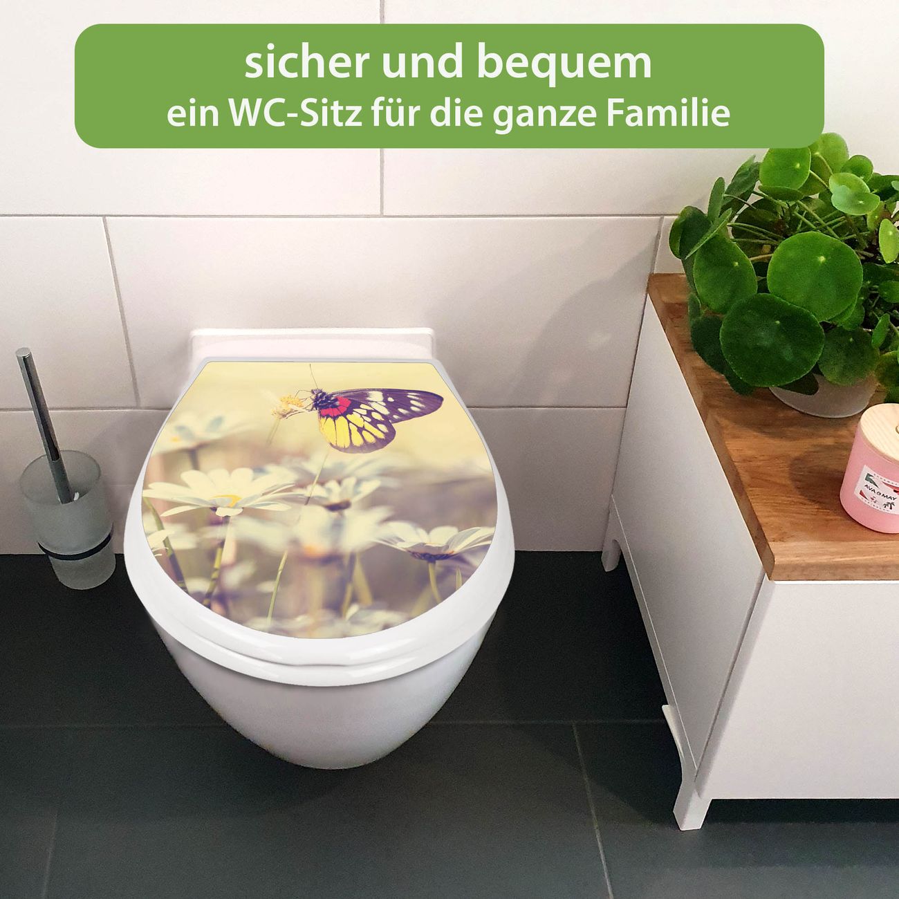 FUNKTION:Mit dem banjado Familien WC Sitz mit Absenkautomatik und dem Motiv Motiv Rotgelber Falter verbinden Sie Design mit Funktionalität. Sie erhalten den Toilettendeckel in bewährt guter Qualität mit Montagematerial passend auf alle Euro-WC-Becken. Die Gesamtgröße beträgt 37,1cm x 44,9cm x 5cm, die Grundfarbe ist weiß.</p> DESIGN:Der Klodeckel in weiß mit Motiv Motiv Rotgelber Falter hat eine ansprechende Optik, eine besondere Form und ist sehr stabil. Das Motiv besteht aus einer farbbrillianten Motivfolie, die durch ein Schutzlaminat zusätzlich vor Kratzern schützt. Der integrierte Kindersitz fügt sich harmonisch ein. DETAILS:Der Toilettensitz mit Soft Close besteht aus hochwertigem Polypropylen, ist geruchlos, ungiftig und kann mit handelsüblicher Seife gereinigt werden. Die Montage kann von von oben oder von unten erfolgen und ist kinderleicht. NUTZEN:Mit Hilfe der detaillierten Aufbauanleitung ermöglichen wir eine schnelle und unkomplizierte Montage. Die banjado Klobrille ist universell geeignet für alle Euro-WC-Schüsseln. Der Kindersitz kann unkompliziert entfernt werden. BANJADO:Ihr WC-Deckel wird in Sachsen in einer kleinen Manufaktur von Hand veredelt. Die Motivfolie ist lösungsmittelfrei und schutzlaminiert für einen langen Halt. Wir wünschen viel Freude bei der Auswahl eines schönen Motivs.