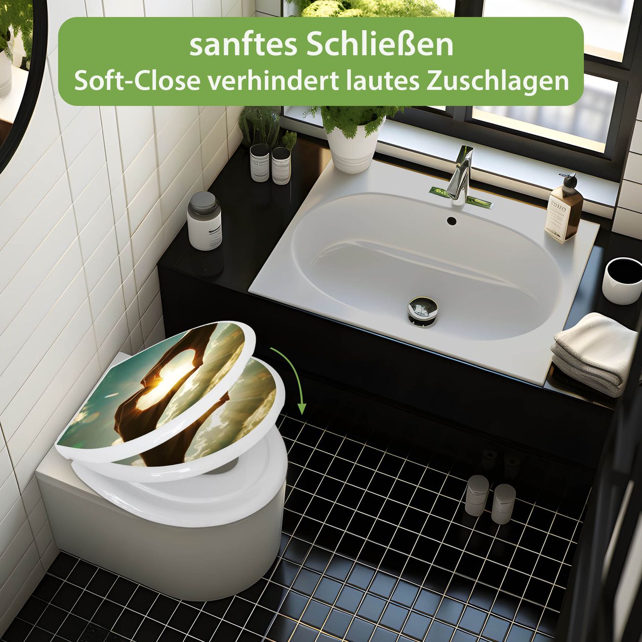 FUNKTION:Mit dem banjado Familien WC Sitz mit Absenkautomatik und dem Motiv Motiv Sonne im Herzen verbinden Sie Design mit Funktionalität. Sie erhalten den Toilettendeckel in bewährt guter Qualität mit Montagematerial passend auf alle Euro-WC-Becken. Die Gesamtgröße beträgt 37,1cm x 44,9cm x 5cm, die Grundfarbe ist weiß.</p> DESIGN:Der Klodeckel in weiß mit Motiv Motiv Sonne im Herzen hat eine ansprechende Optik, eine besondere Form und ist sehr stabil. Das Motiv besteht aus einer farbbrillianten Motivfolie, die durch ein Schutzlaminat zusätzlich vor Kratzern schützt. Der integrierte Kindersitz fügt sich harmonisch ein. DETAILS:Der Toilettensitz mit Soft Close besteht aus hochwertigem Polypropylen, ist geruchlos, ungiftig und kann mit handelsüblicher Seife gereinigt werden. Die Montage kann von von oben oder von unten erfolgen und ist kinderleicht. NUTZEN:Mit Hilfe der detaillierten Aufbauanleitung ermöglichen wir eine schnelle und unkomplizierte Montage. Die banjado Klobrille ist universell geeignet für alle Euro-WC-Schüsseln. Der Kindersitz kann unkompliziert entfernt werden. BANJADO:Ihr WC-Deckel wird in Sachsen in einer kleinen Manufaktur von Hand veredelt. Die Motivfolie ist lösungsmittelfrei und schutzlaminiert für einen langen Halt. Wir wünschen viel Freude bei der Auswahl eines schönen Motivs.
