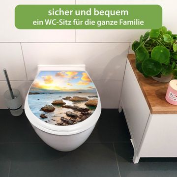 FUNKTION:Mit dem banjado Familien WC Sitz mit Absenkautomatik und dem Motiv Motiv Sonnenaufgang am Meer verbinden Sie Design mit Funktionalität. Sie erhalten den Toilettendeckel in bewährt guter Qualität mit Montagematerial passend auf alle Euro-WC-Becken. Die Gesamtgröße beträgt 37,1cm x 44,9cm x 5cm, die Grundfarbe ist weiß.</p> DESIGN:Der Klodeckel in weiß mit Motiv Motiv Sonnenaufgang am Meer hat eine ansprechende Optik, eine besondere Form und ist sehr stabil. Das Motiv besteht aus einer farbbrillianten Motivfolie, die durch ein Schutzlaminat zusätzlich vor Kratzern schützt. Der integrierte Kindersitz fügt sich harmonisch ein. DETAILS:Der Toilettensitz mit Soft Close besteht aus hochwertigem Polypropylen, ist geruchlos, ungiftig und kann mit handelsüblicher Seife gereinigt werden. Die Montage kann von von oben oder von unten erfolgen und ist kinderleicht. NUTZEN:Mit Hilfe der detaillierten Aufbauanleitung ermöglichen wir eine schnelle und unkomplizierte Montage. Die banjado Klobrille ist universell geeignet für alle Euro-WC-Schüsseln. Der Kindersitz kann unkompliziert entfernt werden. BANJADO:Ihr WC-Deckel wird in Sachsen in einer kleinen Manufaktur von Hand veredelt. Die Motivfolie ist lösungsmittelfrei und schutzlaminiert für einen langen Halt. Wir wünschen viel Freude bei der Auswahl eines schönen Motivs.