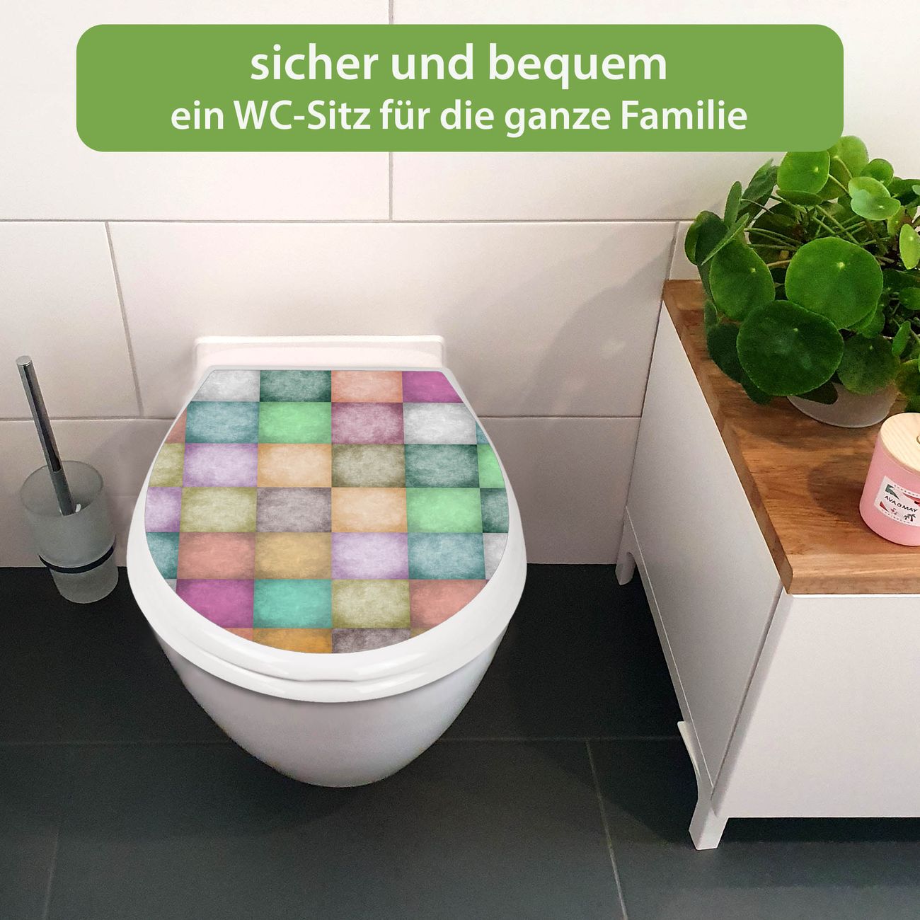 FUNKTION:Mit dem banjado Familien WC Sitz mit Absenkautomatik und dem Motiv Motiv Verwaschene Quadrate verbinden Sie Design mit Funktionalität. Sie erhalten den Toilettendeckel in bewährt guter Qualität mit Montagematerial passend auf alle Euro-WC-Becken. Die Gesamtgröße beträgt 37,1cm x 44,9cm x 5cm, die Grundfarbe ist weiß.</p> DESIGN:Der Klodeckel in weiß mit Motiv Motiv Verwaschene Quadrate hat eine ansprechende Optik, eine besondere Form und ist sehr stabil. Das Motiv besteht aus einer farbbrillianten Motivfolie, die durch ein Schutzlaminat zusätzlich vor Kratzern schützt. Der integrierte Kindersitz fügt sich harmonisch ein. DETAILS:Der Toilettensitz mit Soft Close besteht aus hochwertigem Polypropylen, ist geruchlos, ungiftig und kann mit handelsüblicher Seife gereinigt werden. Die Montage kann von von oben oder von unten erfolgen und ist kinderleicht. NUTZEN:Mit Hilfe der detaillierten Aufbauanleitung ermöglichen wir eine schnelle und unkomplizierte Montage. Die banjado Klobrille ist universell geeignet für alle Euro-WC-Schüsseln. Der Kindersitz kann unkompliziert entfernt werden. BANJADO:Ihr WC-Deckel wird in Sachsen in einer kleinen Manufaktur von Hand veredelt. Die Motivfolie ist lösungsmittelfrei und schutzlaminiert für einen langen Halt. Wir wünschen viel Freude bei der Auswahl eines schönen Motivs.