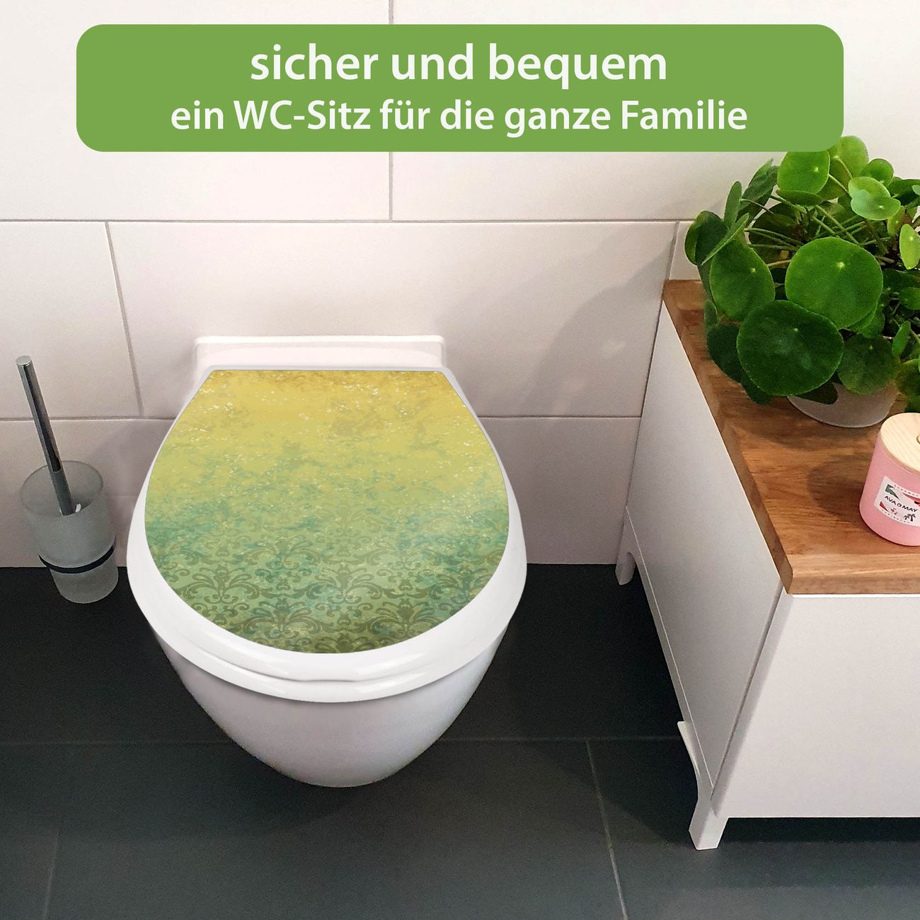 FUNKTION:Mit dem banjado Familien WC Sitz mit Absenkautomatik und dem Motiv Motiv Vintage Messing verbinden Sie Design mit Funktionalität. Sie erhalten den Toilettendeckel in bewährt guter Qualität mit Montagematerial passend auf alle Euro-WC-Becken. Die Gesamtgröße beträgt 37,1cm x 44,9cm x 5cm, die Grundfarbe ist weiß.</p> DESIGN:Der Klodeckel in weiß mit Motiv Motiv Vintage Messing hat eine ansprechende Optik, eine besondere Form und ist sehr stabil. Das Motiv besteht aus einer farbbrillianten Motivfolie, die durch ein Schutzlaminat zusätzlich vor Kratzern schützt. Der integrierte Kindersitz fügt sich harmonisch ein. DETAILS:Der Toilettensitz mit Soft Close besteht aus hochwertigem Polypropylen, ist geruchlos, ungiftig und kann mit handelsüblicher Seife gereinigt werden. Die Montage kann von von oben oder von unten erfolgen und ist kinderleicht. NUTZEN:Mit Hilfe der detaillierten Aufbauanleitung ermöglichen wir eine schnelle und unkomplizierte Montage. Die banjado Klobrille ist universell geeignet für alle Euro-WC-Schüsseln. Der Kindersitz kann unkompliziert entfernt werden. BANJADO:Ihr WC-Deckel wird in Sachsen in einer kleinen Manufaktur von Hand veredelt. Die Motivfolie ist lösungsmittelfrei und schutzlaminiert für einen langen Halt. Wir wünschen viel Freude bei der Auswahl eines schönen Motivs.
