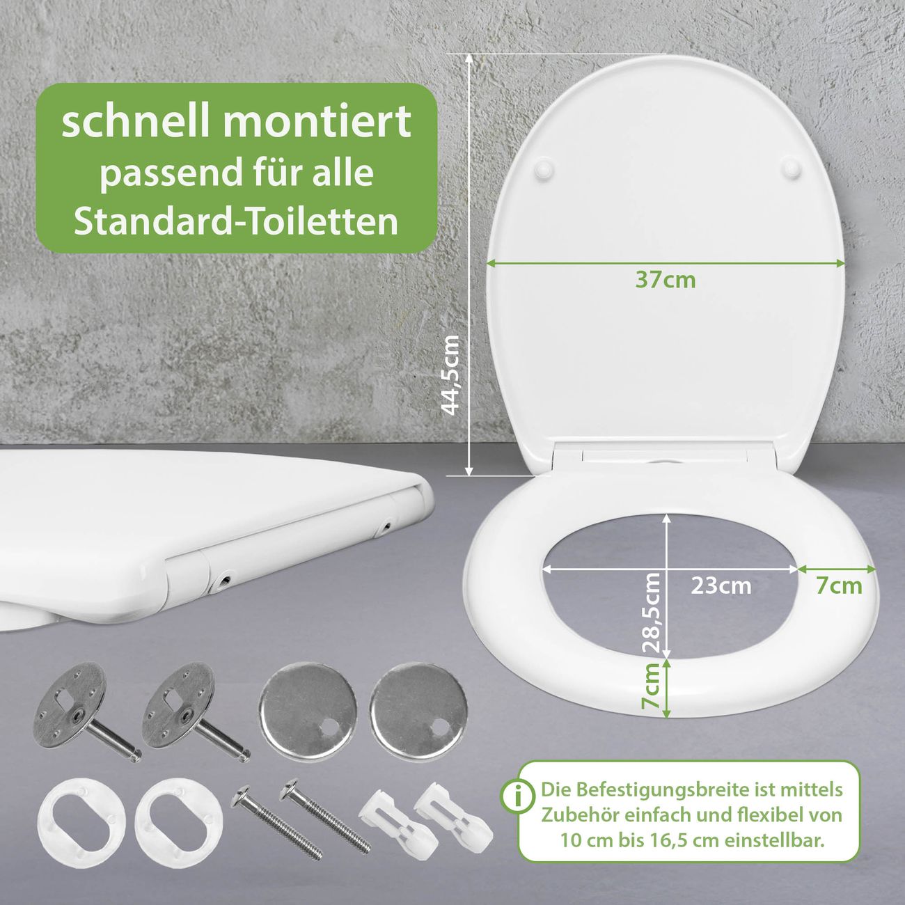 - Material: WC-Sitz und Deckel aus robustem Duroplast
