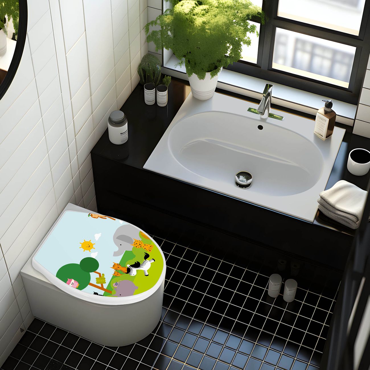 FUNKTION:Mit dem banjado Familien WC Sitz mit Absenkautomatik und dem Motiv Wilde Tiere verbinden Sie Design mit Funktionalität. Sie erhalten den Toilettendeckel in bewährt guter Qualität mit Montagematerial passend auf alle Euro-WC-Becken. Die Gesamtgröße beträgt 37cm x 44,5cm x 5cm, die Grundfarbe ist weiß.</p> DESIGN:Der Klodeckel in weiß mit Motiv Wilde Tiere hat eine ansprechende Optik, eine besondere Form und ist sehr stabil. Das Motiv besteht aus einer farbbrillianten Motivfolie, die durch ein Schutzlaminat zusätzlich vor Kratzern schützt. Der integrierte Kindersitz fügt sich harmonisch ein. DETAILS:Der Toilettensitz mit Soft Close besteht aus hochwertigem Polypropylen, ist geruchlos, ungiftig und kann mit handelsüblicher Seife gereinigt werden. Die Montage kann von von oben oder von unten erfolgen und ist kinderleicht. NUTZEN:Mit Hilfe der detaillierten Aufbauanleitung ermöglichen wir eine schnelle und unkomplizierte Montage. Die banjado Klobrille ist universell geeignet für alle Euro-WC-Schüsseln. Der Kindersitz kann unkompliziert entfernt werden. BANJADO:Ihr WC-Deckel wird in Sachsen in einer kleinen Manufaktur von Hand veredelt. Die Motivfolie ist lösungsmittelfrei und schutzlaminiert für einen langen Halt. Wir wünschen viel Freude bei der Auswahl eines schönen Motivs.
