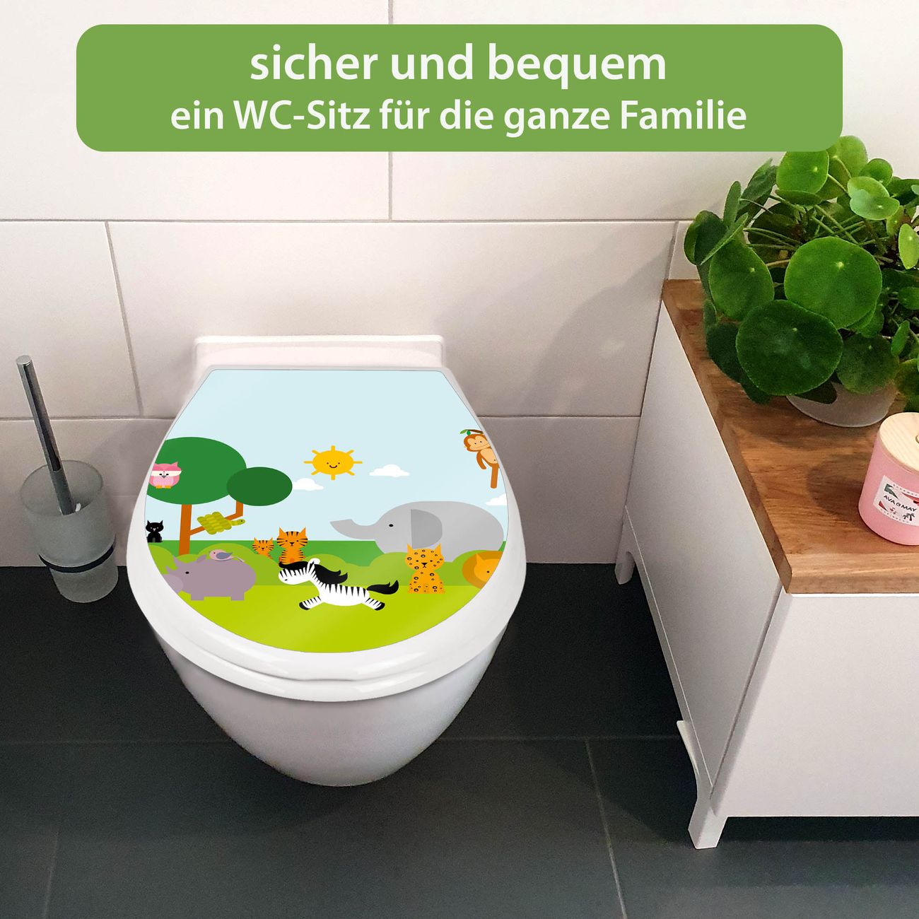 FUNKTION:Mit dem banjado Familien WC Sitz mit Absenkautomatik und dem Motiv Motiv Wilde Tiere verbinden Sie Design mit Funktionalität. Sie erhalten den Toilettendeckel in bewährt guter Qualität mit Montagematerial passend auf alle Euro-WC-Becken. Die Gesamtgröße beträgt 37,1cm x 44,9cm x 5cm, die Grundfarbe ist weiß.</p> DESIGN:Der Klodeckel in weiß mit Motiv Motiv Wilde Tiere hat eine ansprechende Optik, eine besondere Form und ist sehr stabil. Das Motiv besteht aus einer farbbrillianten Motivfolie, die durch ein Schutzlaminat zusätzlich vor Kratzern schützt. Der integrierte Kindersitz fügt sich harmonisch ein. DETAILS:Der Toilettensitz mit Soft Close besteht aus hochwertigem Polypropylen, ist geruchlos, ungiftig und kann mit handelsüblicher Seife gereinigt werden. Die Montage kann von von oben oder von unten erfolgen und ist kinderleicht. NUTZEN:Mit Hilfe der detaillierten Aufbauanleitung ermöglichen wir eine schnelle und unkomplizierte Montage. Die banjado Klobrille ist universell geeignet für alle Euro-WC-Schüsseln. Der Kindersitz kann unkompliziert entfernt werden. BANJADO:Ihr WC-Deckel wird in Sachsen in einer kleinen Manufaktur von Hand veredelt. Die Motivfolie ist lösungsmittelfrei und schutzlaminiert für einen langen Halt. Wir wünschen viel Freude bei der Auswahl eines schönen Motivs.