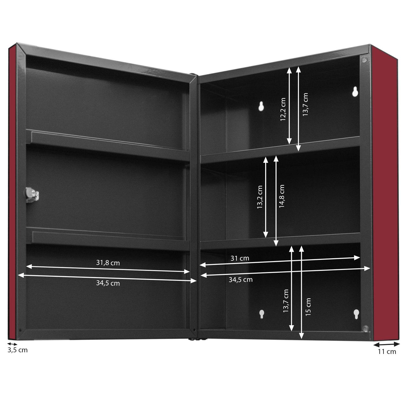 Der Medizinschrank ist gesamt 35x46x15cm groß und wiegt ca. 3900g. Der Türanschlag ist links und kann nicht verändert werden, die Fronttür öffnet ca. 115°. Die Folierung befindet sich auf der Front und den Seiten. Das Gehäuse ist zeitlos anthrazit und aus Stahl gefertigt. Die innenliegenden Fächer haben verschiedene Größen für unterschiedliche Aufbewahrungsmöglichkeiten, in der Innentür können ebenfalls Dinge abgelegt werden. Befestigt wird der Medizinschrank an 4 Stellen auf der Rückseite, Sie erhalten 3 Schlüssel.