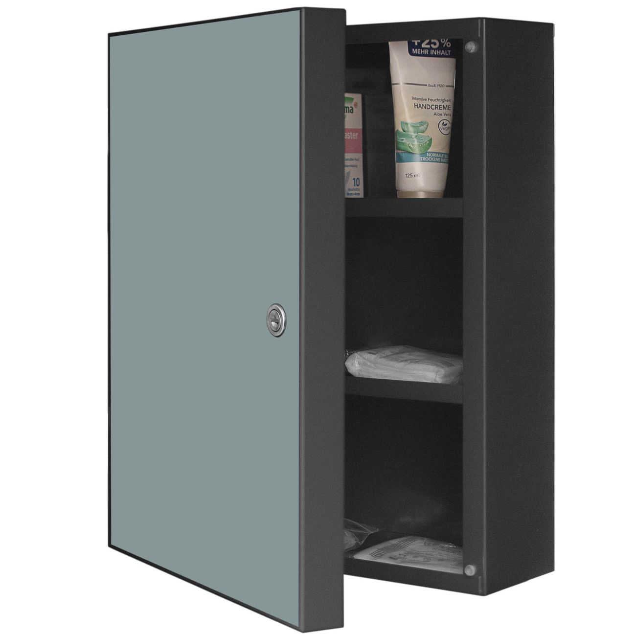 Der Medizinschrank ist gesamt 35x46x15cm groß und wiegt ca. 3900g. Der Türanschlag ist links und kann nicht verändert werden, die Fronttür öffnet ca. 115°. Die Folierung befindet sich auf der Front. Das Gehäuse ist zeitlos anthrazit und aus Stahl gefertigt. Die innenliegenden Fächer haben verschiedene Größen für unterschiedliche Aufbewahrungsmöglichkeiten, in der Innentür können ebenfalls Dinge abgelegt werden. Befestigt wird der Medizinschrank an 4 Stellen auf der Rückseite, Sie erhalten 3 Schlüssel.