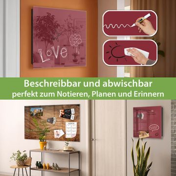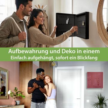 Bringe Ordnung und Eleganz in deinen Eingangsbereich mit dem banjado Schlüsselkasten Motiv Farbe Burgund. Die moderne Schlüsselbox kombiniert funktionales Design mit hochwertiger Verarbeitung und wird so zu einem echten Hingucker in Flur, Büro oder Ferienwohnung. ✅ Stilvolle Schlüsselaufbewahrung mit Glasfront im Motiv Farbe Burgund Der Design-Schlüsselkasten Motiv Farbe Burgund bietet Platz für bis zu 50 Schlüssel, die auf 5 stabilen Reihen mit je 10 Haken übersichtlich verstaut werden. Mit seinen kompakten Maßen von 30 x 30 x 5 cm passt die Schlüsselbox perfekt auch in kleinere Räume. Der schwarz lackierte Stahlkorpus mit rechts angeschlagenem Türscharnier harmoniert mit der Glasfront und fügt sich nahtlos in jedes Wohnambiente ein. Ob als Schlüsselorganizer für Zuhause oder als praktische Lösung für Büros, Praxen und Gewerbe, der banjado Schlüsselkasten sorgt für Ordnung und Übersicht. Dank der magnetischen, mit Kreidestiften beschreibbaren Glasfront kannst du Notizen anheften oder Termine direkt auf der Oberfläche festhalten. Die Schlüsselbox Motiv Farbe Burgund zur Wandmontage wird inklusive Befestigungsmaterial geliefert und ist schnell angebracht. So hast du deine Schlüssel jederzeit griffbereit und zugleich stilvoll verstaut. Mit diesem banjado Schlüsselkasten Motiv Farbe Burgund kombinierst du praktische Aufbewahrung mit stilvollem Wohndesign. Ob privat oder geschäftlich, die Schlüsselbox sorgt für mehr Ordnung, Übersicht und ein wohnliches Ambiente.Vorteile im Überblick