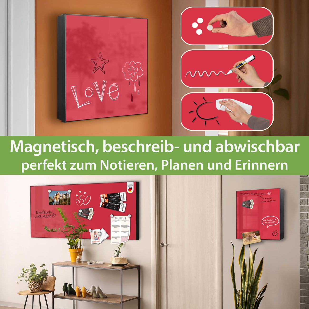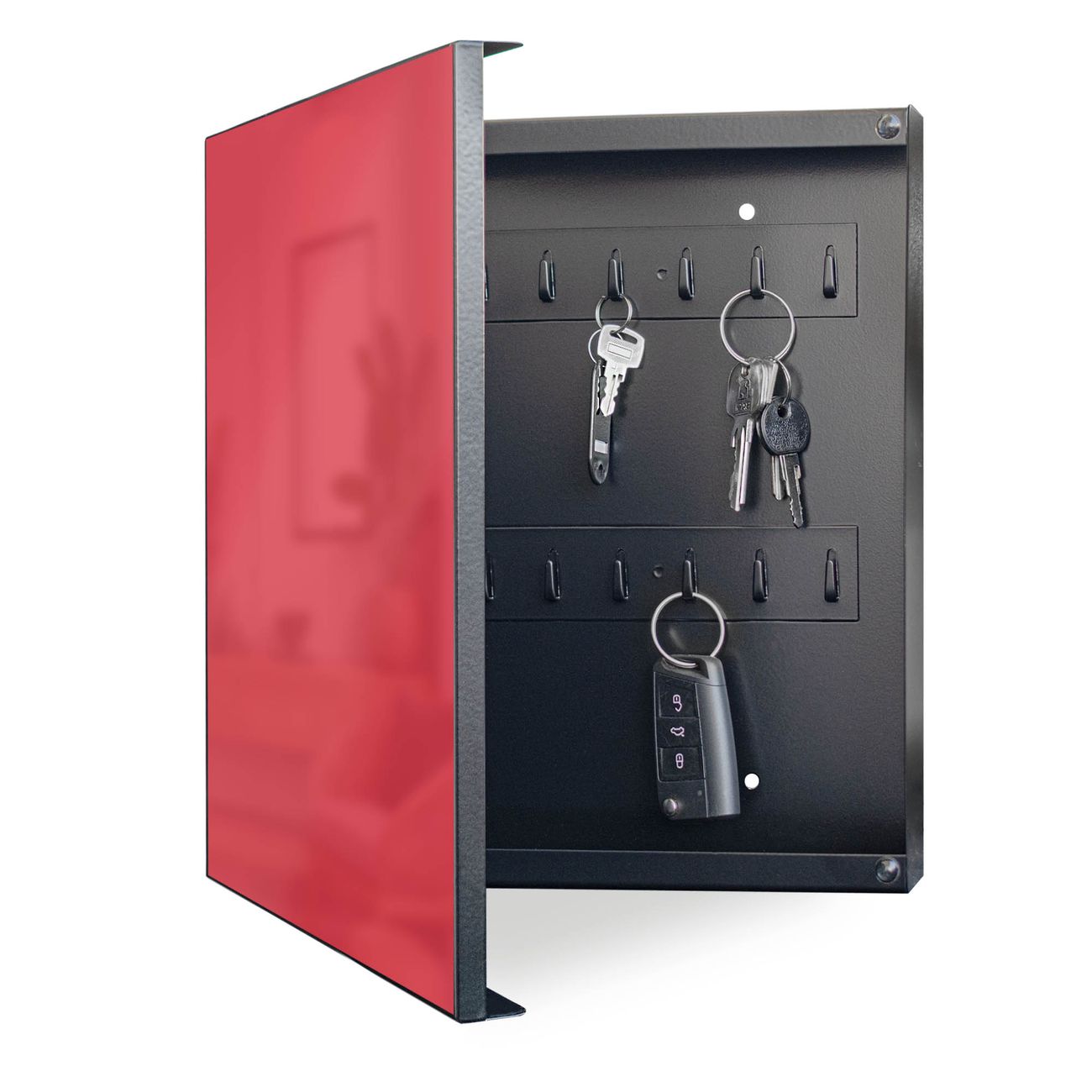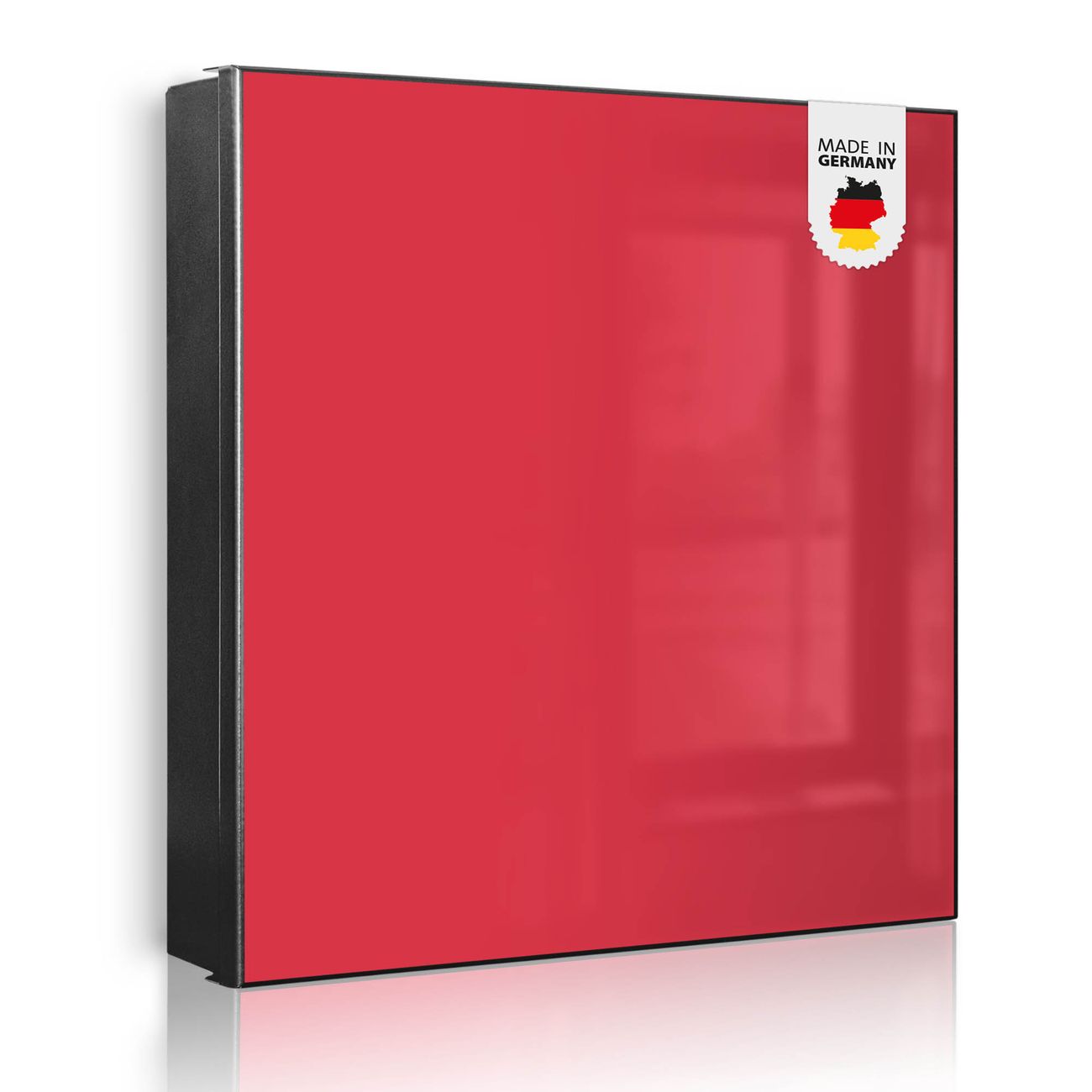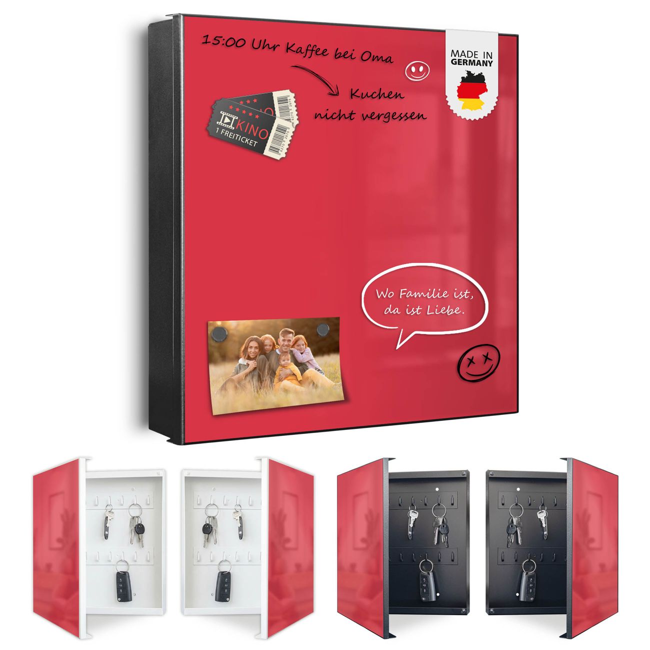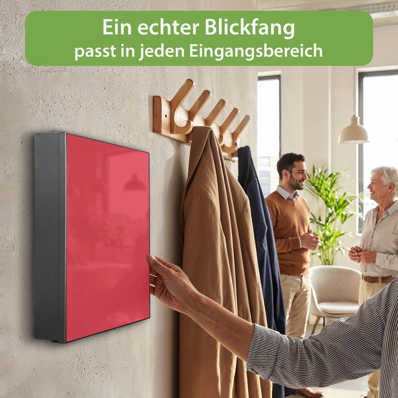 Bringe Ordnung und Eleganz in deinen Eingangsbereich mit dem banjado Schlüsselkasten Motiv Farbe Feuerrot. Die moderne Schlüsselbox kombiniert funktionales Design mit hochwertiger Verarbeitung und wird so zu einem echten Hingucker in Flur, Büro oder Ferienwohnung. ✅ Stilvolle Schlüsselaufbewahrung mit Motiv Farbe Feuerrot Der Design-Schlüsselkasten Motiv Farbe Feuerrot bietet Platz für bis zu 32 Schlüssel, die auf 4 stabilen Reihen mit je 8 Haken übersichtlich verstaut werden. Mit seinen kompakten Maßen von 30 x 30 x 5 cm passt die Schlüsselbox perfekt auch in kleinere Räume. Der schwarz lackierte Stahlkorpus mit links angeschlagenem Türscharnier harmoniert mit gedruckten Folie auf der Front und fügt sich nahtlos in jedes Wohnambiente ein. Ob als Schlüsselorganizer für Zuhause oder als praktische Lösung für Büros, Praxen und Gewerbe, der banjado Schlüsselkasten sorgt für Ordnung und Übersicht. Dank der magnetischen, mit Kreidestiften beschreibbaren Folie auf der Front kannst du Notizen anheften oder Termine direkt auf der Oberfläche festhalten. Die Schlüsselbox Motiv Farbe Feuerrot zur Wandmontage wird inklusive Befestigungsmaterial geliefert und ist schnell angebracht. So hast du deine Schlüssel jederzeit griffbereit und zugleich stilvoll verstaut. Mit diesem banjado Schlüsselkasten Motiv Farbe Feuerrot kombinierst du praktische Aufbewahrung mit stilvollem Wohndesign. Ob privat oder geschäftlich, die Schlüsselbox sorgt für mehr Ordnung, Übersicht und ein wohnliches Ambiente.Vorteile im Überblick