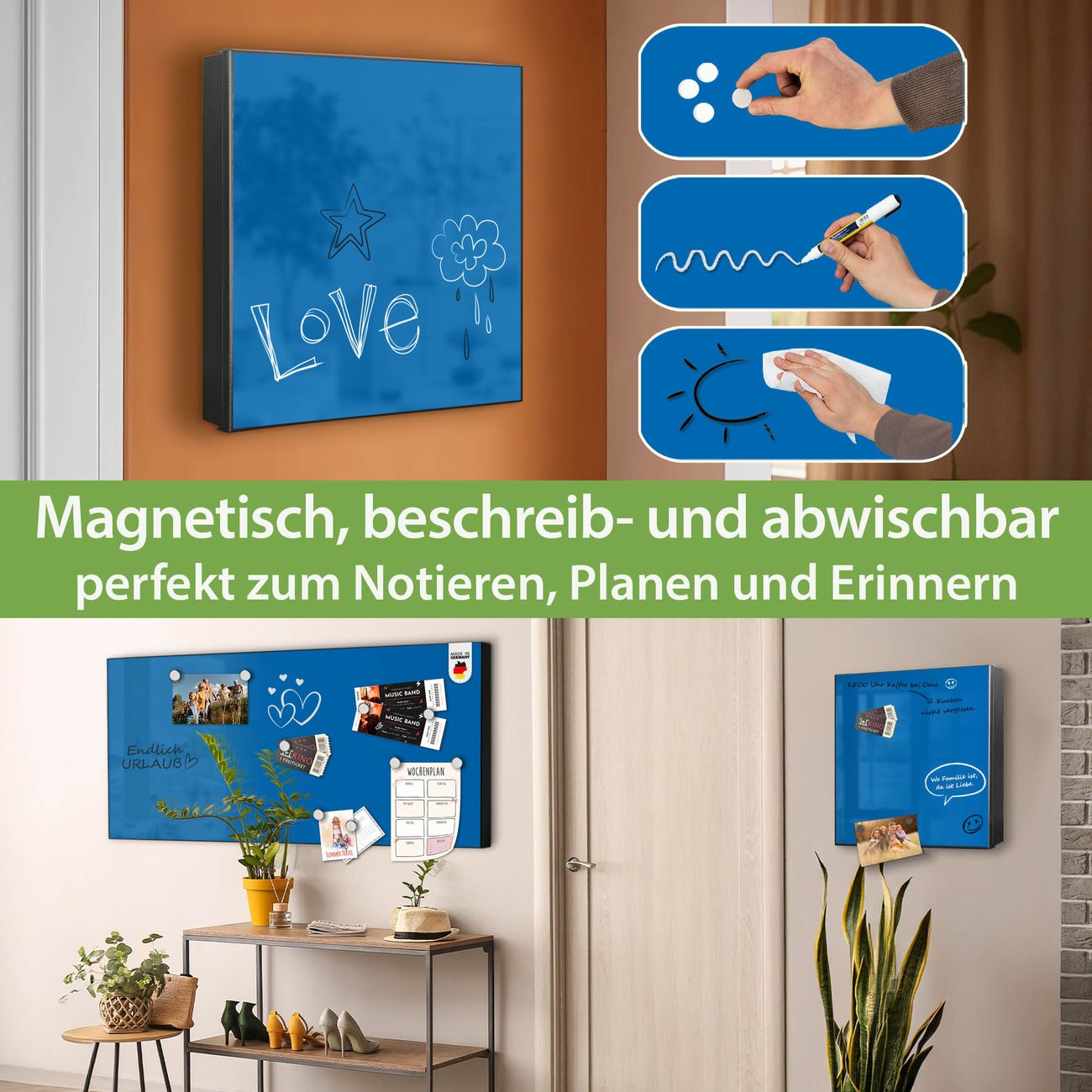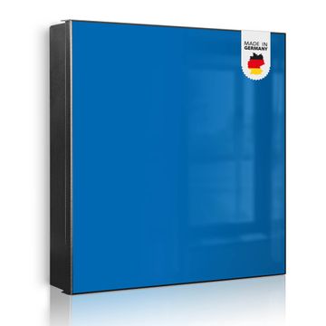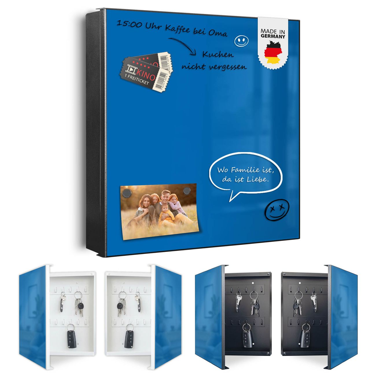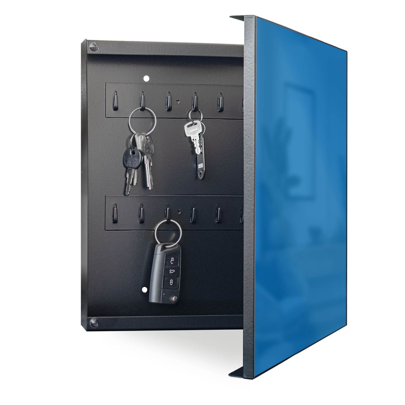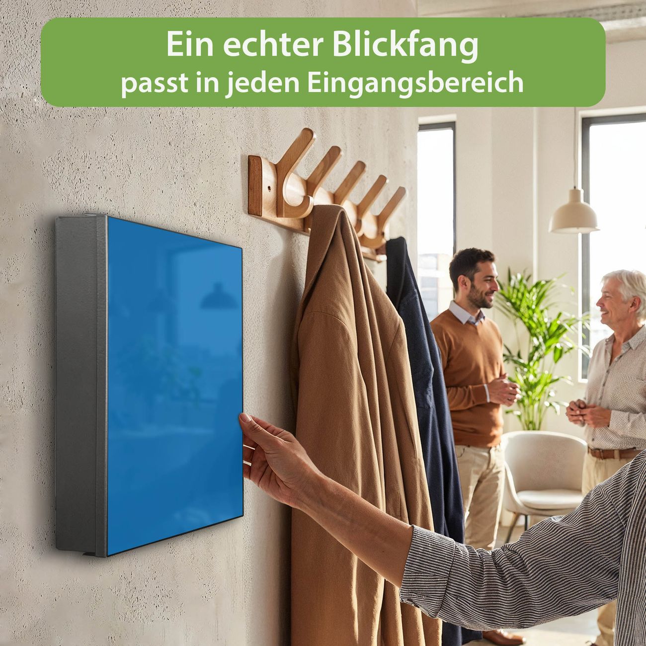 Bringe Ordnung und Eleganz in deinen Eingangsbereich mit dem banjado Schlüsselkasten Motiv Farbe Signalblau. Die moderne Schlüsselbox kombiniert funktionales Design mit hochwertiger Verarbeitung und wird so zu einem echten Hingucker in Flur, Büro oder Ferienwohnung. ✅ Stilvolle Schlüsselaufbewahrung mit Motiv Farbe Signalblau Der Design-Schlüsselkasten Motiv Farbe Signalblau bietet Platz für bis zu 32 Schlüssel, die auf 4 stabilen Reihen mit je 8 Haken übersichtlich verstaut werden. Mit seinen kompakten Maßen von 30 x 30 x 5 cm passt die Schlüsselbox perfekt auch in kleinere Räume. Der schwarz lackierte Stahlkorpus mit rechts angeschlagenem Türscharnier harmoniert mit gedruckten Folie auf der Front und fügt sich nahtlos in jedes Wohnambiente ein. Ob als Schlüsselorganizer für Zuhause oder als praktische Lösung für Büros, Praxen und Gewerbe, der banjado Schlüsselkasten sorgt für Ordnung und Übersicht. Dank der magnetischen, mit Kreidestiften beschreibbaren Folie auf der Front kannst du Notizen anheften oder Termine direkt auf der Oberfläche festhalten. Die Schlüsselbox Motiv Farbe Signalblau zur Wandmontage wird inklusive Befestigungsmaterial geliefert und ist schnell angebracht. So hast du deine Schlüssel jederzeit griffbereit und zugleich stilvoll verstaut. Mit diesem banjado Schlüsselkasten Motiv Farbe Signalblau kombinierst du praktische Aufbewahrung mit stilvollem Wohndesign. Ob privat oder geschäftlich, die Schlüsselbox sorgt für mehr Ordnung, Übersicht und ein wohnliches Ambiente.Vorteile im Überblick