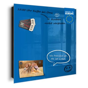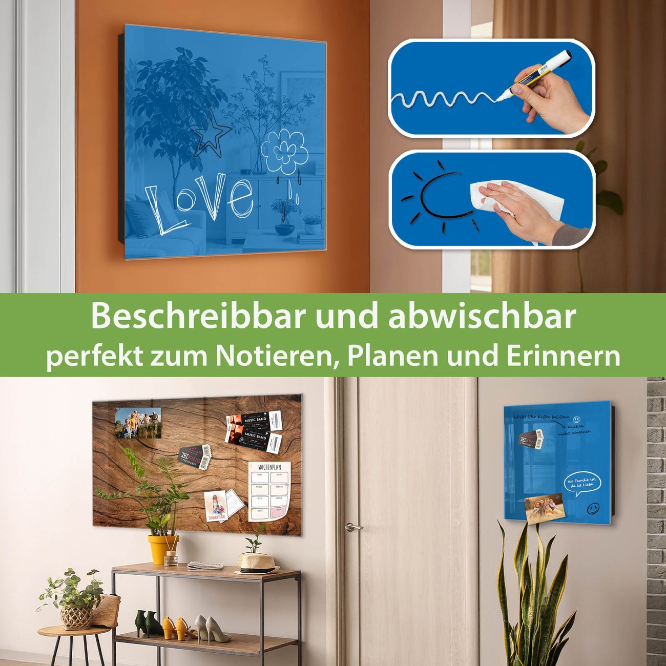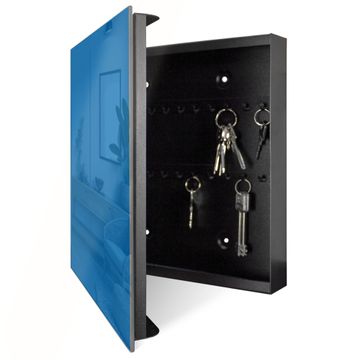 Bringe Ordnung und Eleganz in deinen Eingangsbereich mit dem banjado Schlüsselkasten Motiv Farbe Signalblau. Die moderne Schlüsselbox kombiniert funktionales Design mit hochwertiger Verarbeitung und wird so zu einem echten Hingucker in Flur, Büro oder Ferienwohnung. ✅ Stilvolle Schlüsselaufbewahrung mit Glasfront im Motiv Farbe Signalblau Der Design-Schlüsselkasten Motiv Farbe Signalblau bietet Platz für bis zu 50 Schlüssel, die auf 5 stabilen Reihen mit je 10 Haken übersichtlich verstaut werden. Mit seinen kompakten Maßen von 30 x 30 x 5 cm passt die Schlüsselbox perfekt auch in kleinere Räume. Der schwarz lackierte Stahlkorpus mit rechts angeschlagenem Türscharnier harmoniert mit der Glasfront und fügt sich nahtlos in jedes Wohnambiente ein. Ob als Schlüsselorganizer für Zuhause oder als praktische Lösung für Büros, Praxen und Gewerbe, der banjado Schlüsselkasten sorgt für Ordnung und Übersicht. Dank der magnetischen, mit Kreidestiften beschreibbaren Glasfront kannst du Notizen anheften oder Termine direkt auf der Oberfläche festhalten. Die Schlüsselbox Motiv Farbe Signalblau zur Wandmontage wird inklusive Befestigungsmaterial geliefert und ist schnell angebracht. So hast du deine Schlüssel jederzeit griffbereit und zugleich stilvoll verstaut. Mit diesem banjado Schlüsselkasten Motiv Farbe Signalblau kombinierst du praktische Aufbewahrung mit stilvollem Wohndesign. Ob privat oder geschäftlich, die Schlüsselbox sorgt für mehr Ordnung, Übersicht und ein wohnliches Ambiente.Vorteile im Überblick