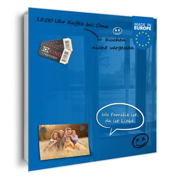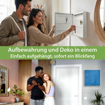Bringe Ordnung und Eleganz in deinen Eingangsbereich mit dem banjado Schlüsselkasten Motiv Farbe Signalblau. Die moderne Schlüsselbox kombiniert funktionales Design mit hochwertiger Verarbeitung und wird so zu einem echten Hingucker in Flur, Büro oder Ferienwohnung. ✅ Stilvolle Schlüsselaufbewahrung mit Glasfront im Motiv Farbe Signalblau Der Design-Schlüsselkasten Motiv Farbe Signalblau bietet Platz für bis zu 50 Schlüssel, die auf 5 stabilen Reihen mit je 10 Haken übersichtlich verstaut werden. Mit seinen kompakten Maßen von 30 x 30 x 5 cm passt die Schlüsselbox perfekt auch in kleinere Räume. Der weiß lackierte Stahlkorpus mit rechts angeschlagenem Türscharnier harmoniert mit der Glasfront und fügt sich nahtlos in jedes Wohnambiente ein. Ob als Schlüsselorganizer für Zuhause oder als praktische Lösung für Büros, Praxen und Gewerbe, der banjado Schlüsselkasten sorgt für Ordnung und Übersicht. Dank der magnetischen, mit Kreidestiften beschreibbaren Glasfront kannst du Notizen anheften oder Termine direkt auf der Oberfläche festhalten. Die Schlüsselbox Motiv Farbe Signalblau zur Wandmontage wird inklusive Befestigungsmaterial geliefert und ist schnell angebracht. So hast du deine Schlüssel jederzeit griffbereit und zugleich stilvoll verstaut. Mit diesem banjado Schlüsselkasten Motiv Farbe Signalblau kombinierst du praktische Aufbewahrung mit stilvollem Wohndesign. Ob privat oder geschäftlich, die Schlüsselbox sorgt für mehr Ordnung, Übersicht und ein wohnliches Ambiente.Vorteile im Überblick